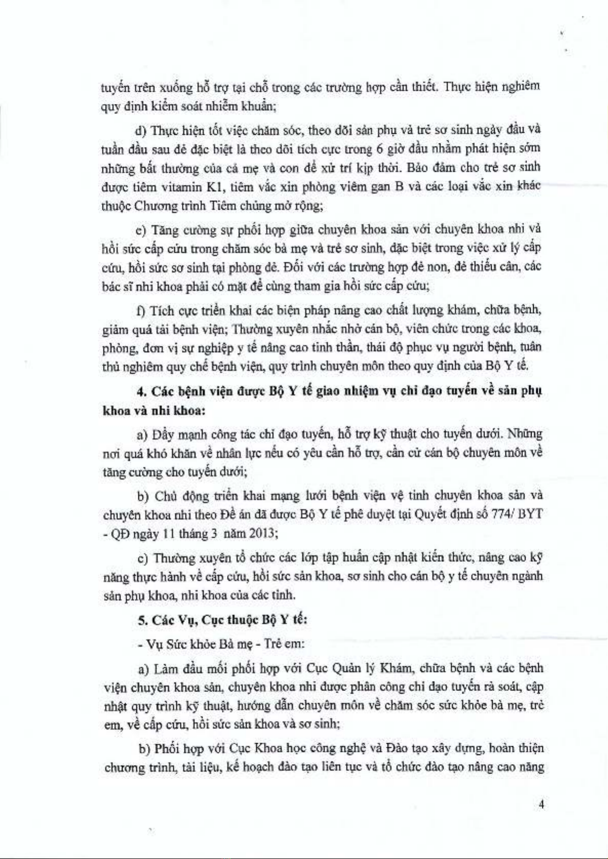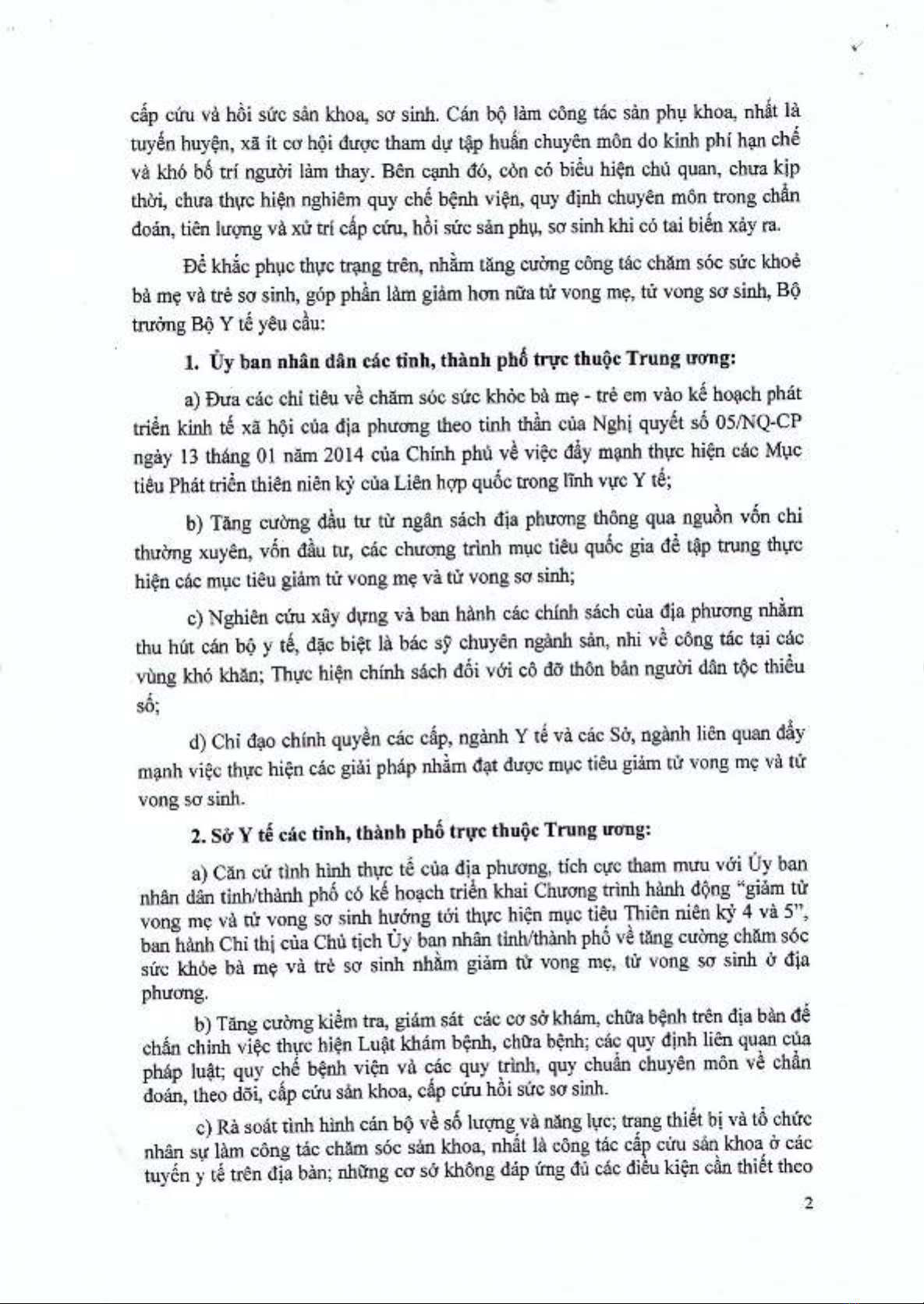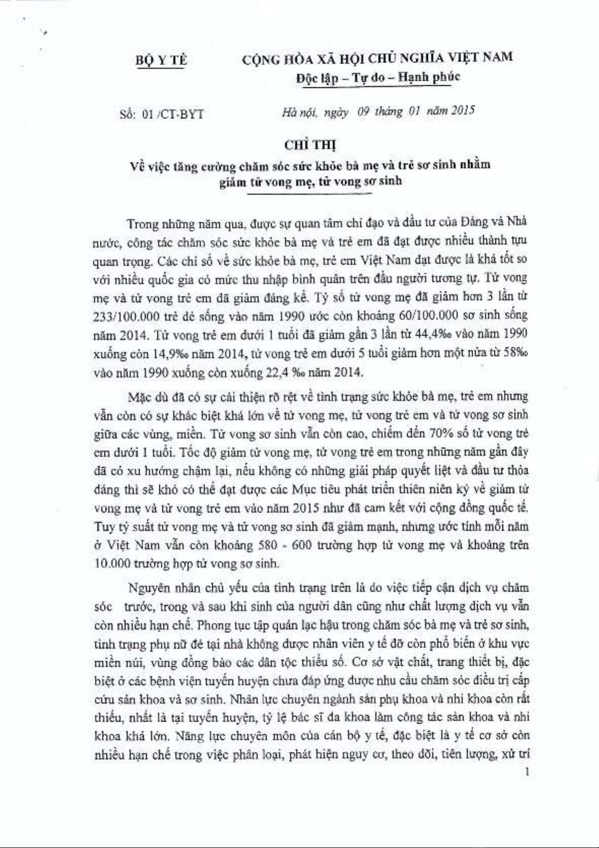 Chỉ thị 01/CT-BYT năm 2015 về tăng cường chăm sóc sức khoẻ bà mẹ và trẻ sơ sinh nhằm giảm tử vong mẹ, tử vong sơ sinh do Bộ Y tế ban hành.