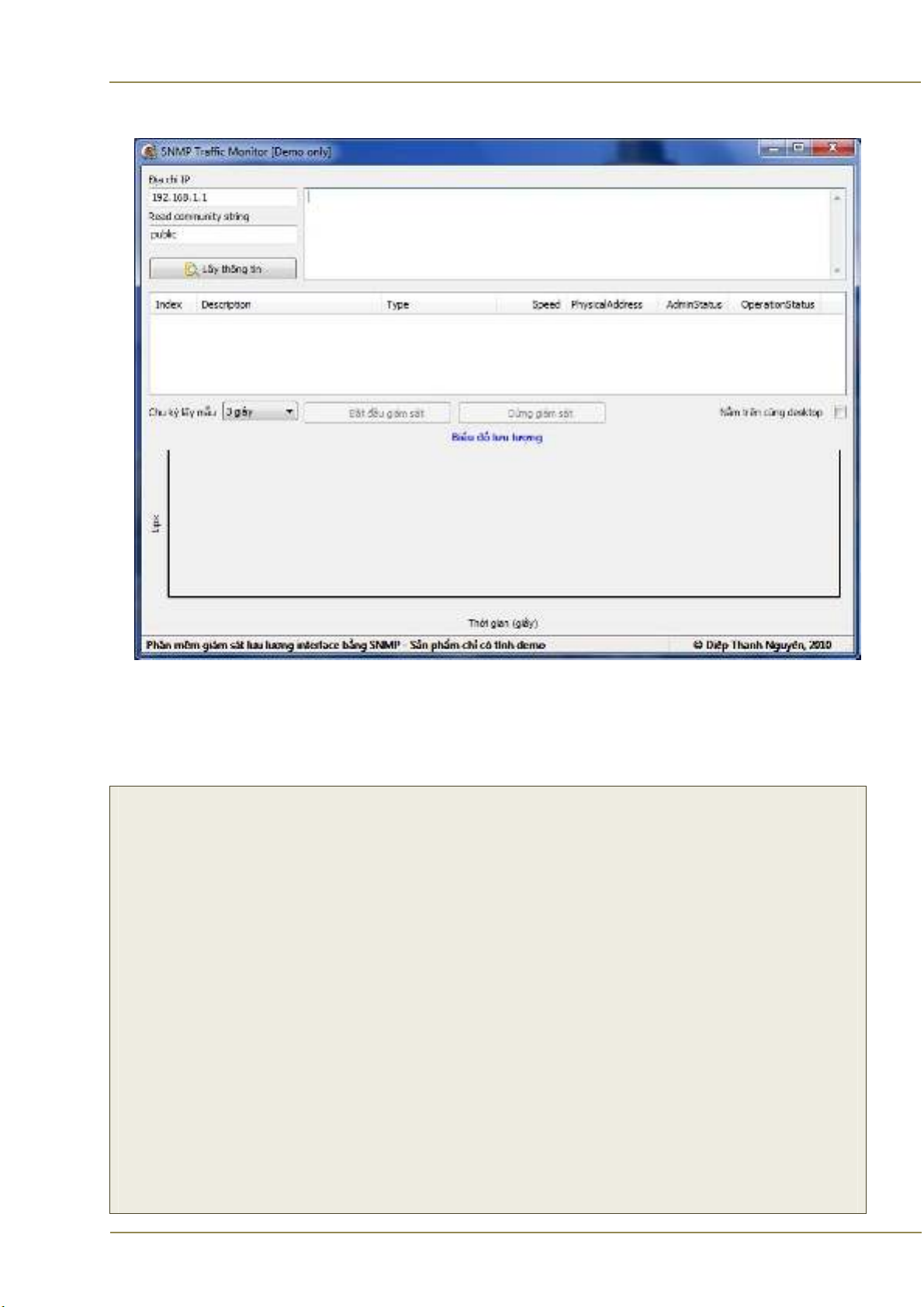 SNMP Traffic Monitor là phần mềm giám sát liên tục lưu lượng của interface trên thiết bị.