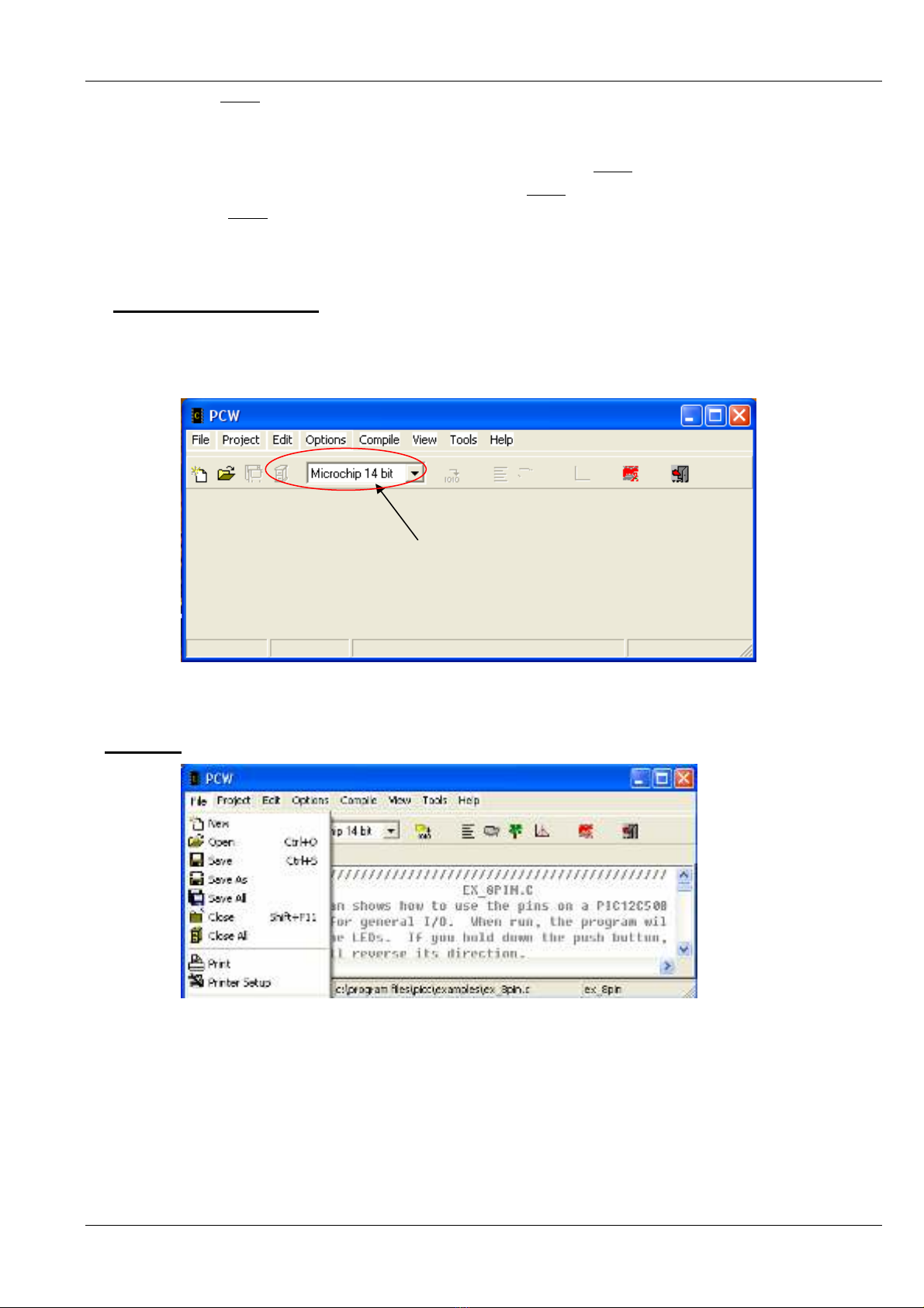 Trong cửa sổ chương trình cửa PIC C compiler gồm có các thực đơn (Menu): File, Project,