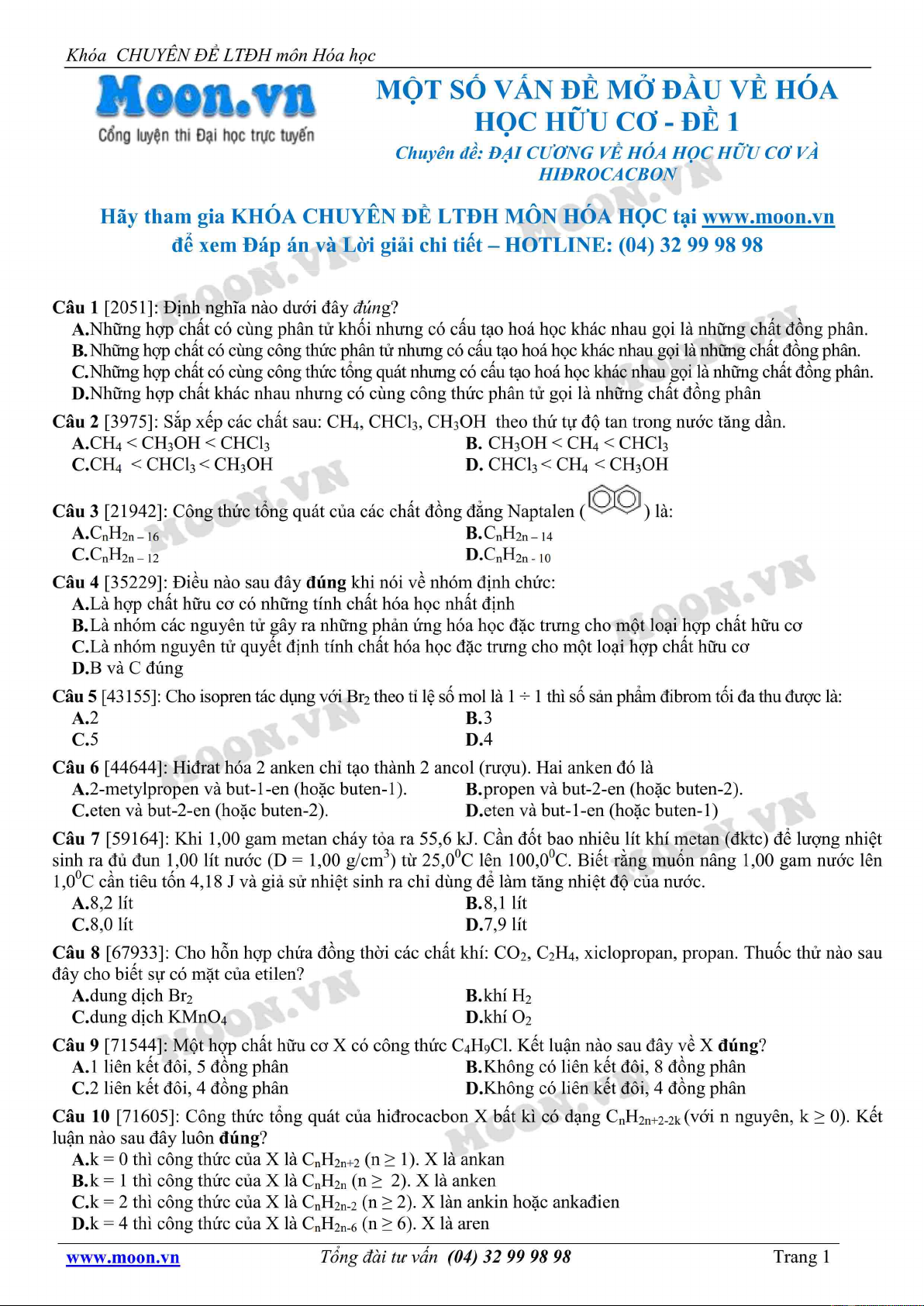 Chuyên đề LTĐH môn Hóa học: Một số vấn đề về hóa học hữu cơ (Đề 1)