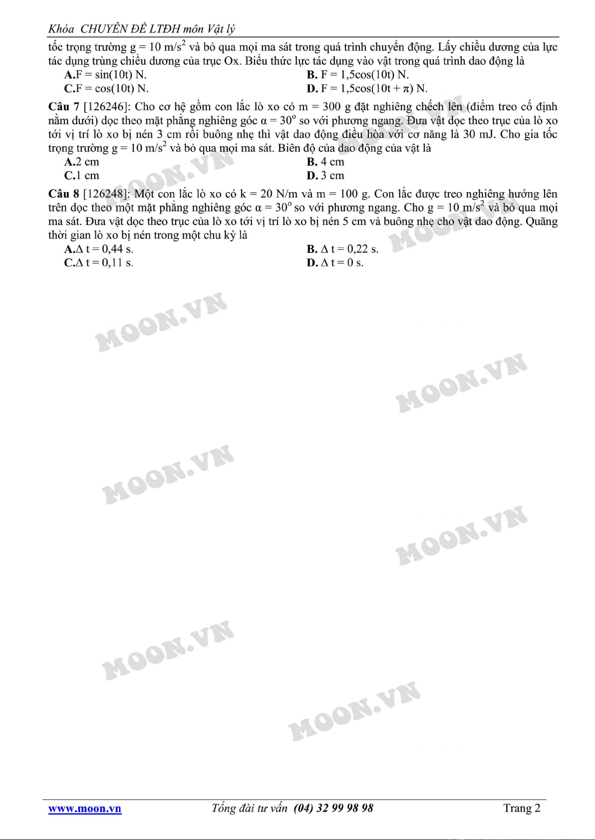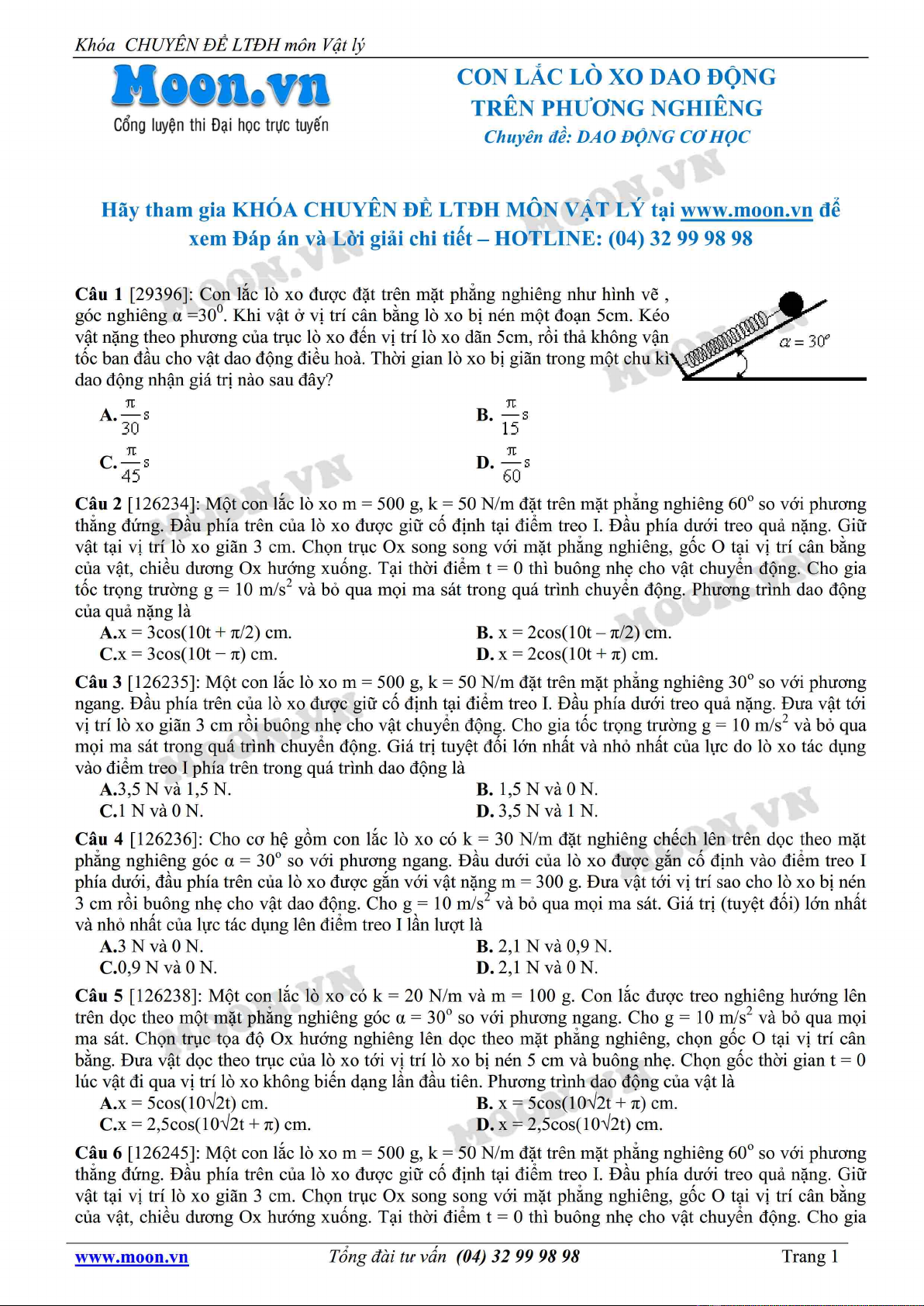 Tài liệu "Chuyên đề LTĐH môn Vật lý: Con lắc lò xo dao động trên phương nghiêng" gồm 8 câu hỏi lý thuyết và bài tập với hình thức trắc nghiệm. Mời các bạn cùng tham khảo để ôn tập, bổ trợ kiến thức và chuẩn bị tốt cho kỳ thi Đại học quan trọng.