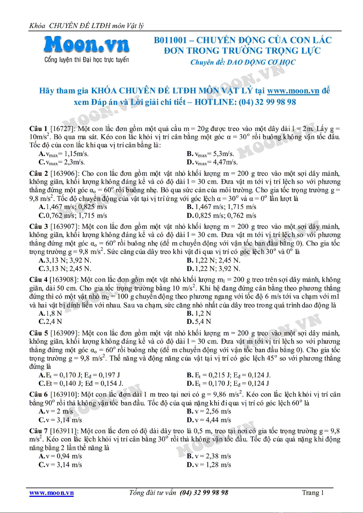 Tài liệu "Chuyên đề LTĐH môn Vật lý: Chuyển động của con lắc đơn trong trường trọng lực" gồm 9 câu hỏi lý thuyết và bài tập với hình thức trắc nghiệm. Mời các bạn cùng tham khảo để ôn tập, bổ trợ kiến thức và chuẩn bị tốt cho kỳ thi Đại học quan trọng.