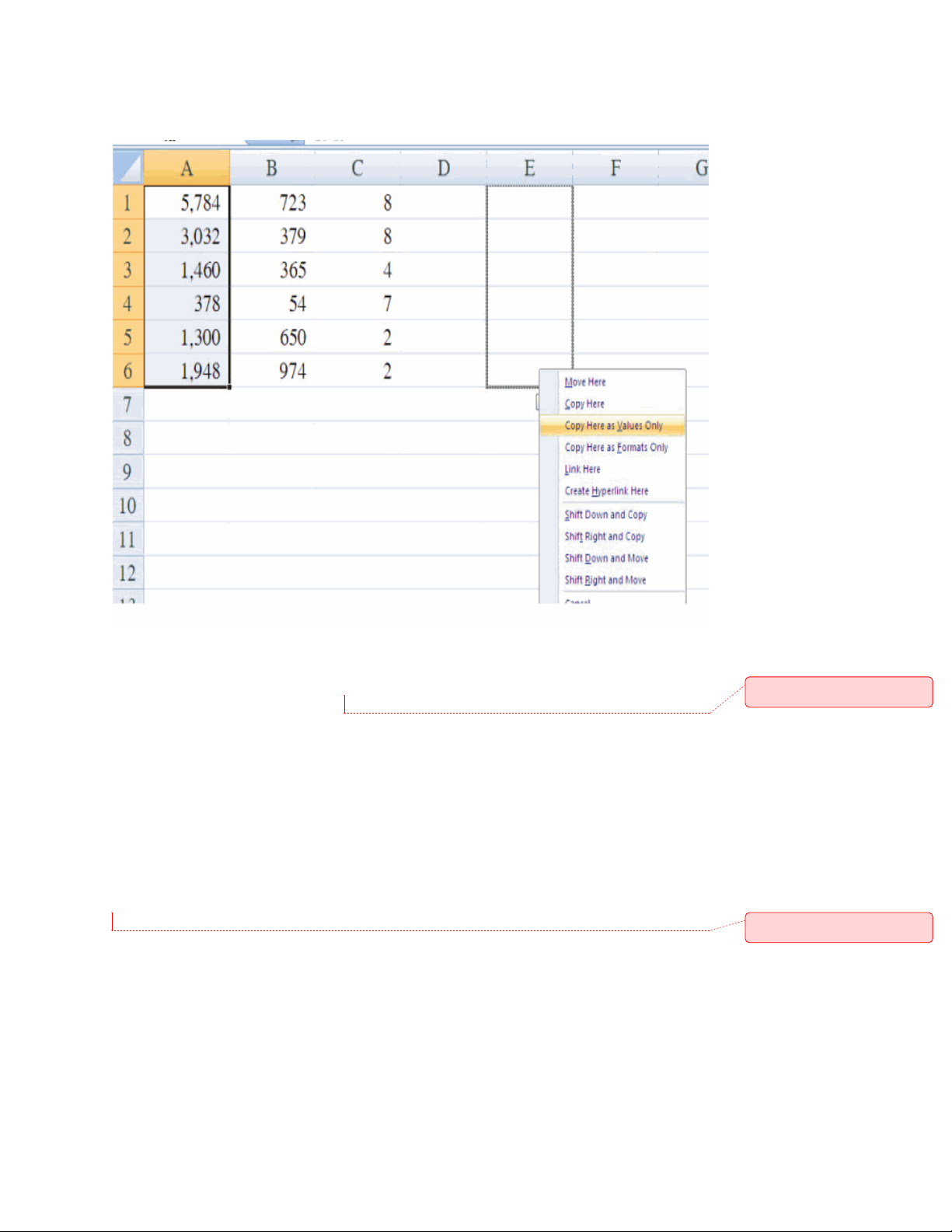 chuột phải, kéo chuột đến nơi cần dán, nhả chuột phải và nhấn "Copy Here as Values