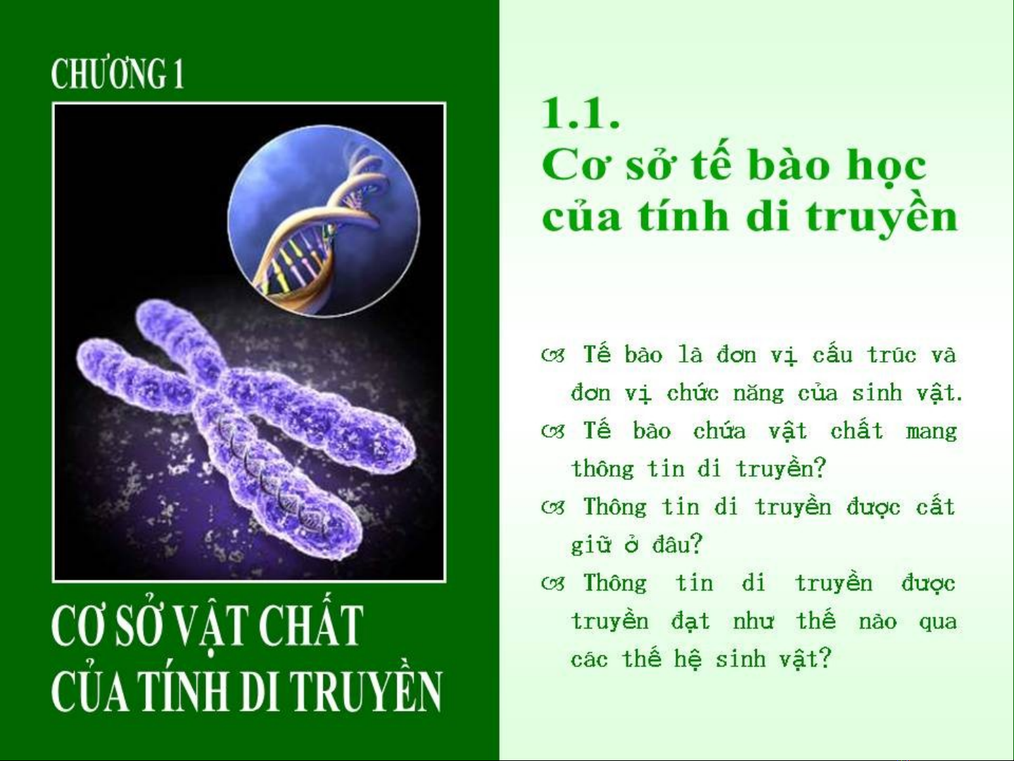 Tế bào là đơn vị cấu trúc và đơn vị chức năng của sinh vật. Tế bào chứa vật chất mang thông tin di truyền? Thông tin di truyền được cất giữ ở đâu? Thông tin di truyền được truyền đạt như thế nào qua các thế hệ sinh vật? Đặc điểm yếu tố mang thông tin di truyền: có tính ổn định (không hay ít bị ảnh hưởng bởi yếu tố ngoại cảnh)