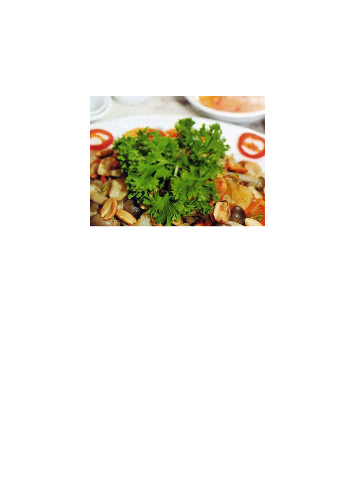 30ml, đường 100g, xì dầu 50ml, rau ngò 10g, đậu phộng 50g, ớt bột khô 30g.