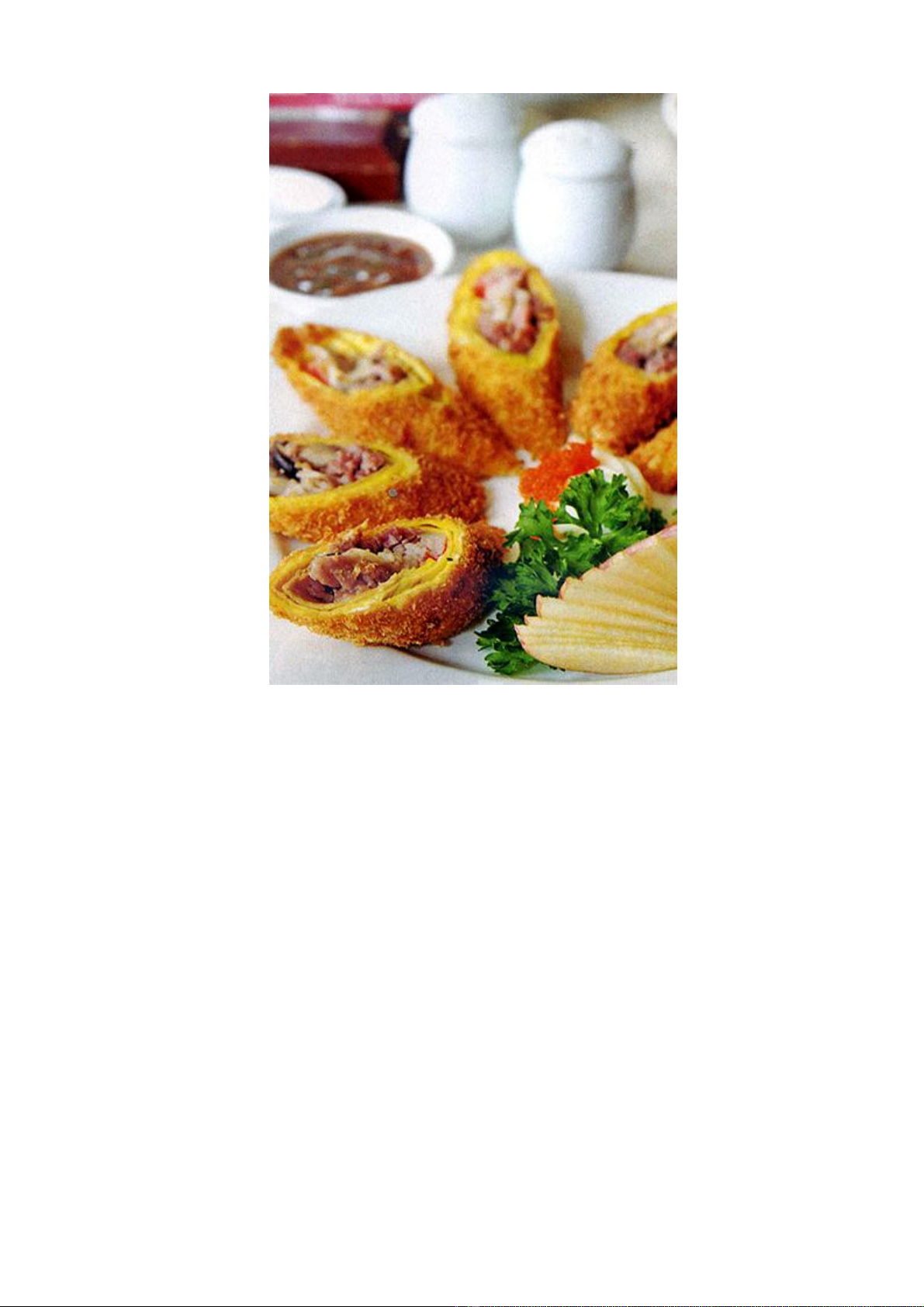 trứng cua) cuốn lại như cuốn sushi. Sau đó lăn qua một lớp bột mì, rồi lăn qua trứng gà