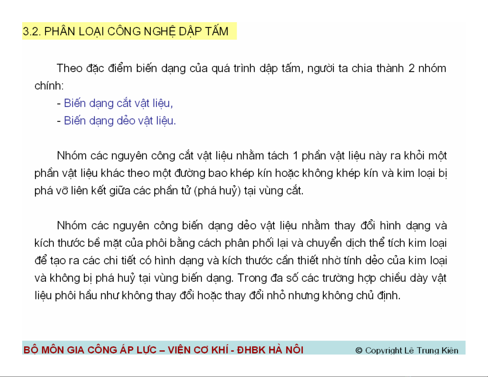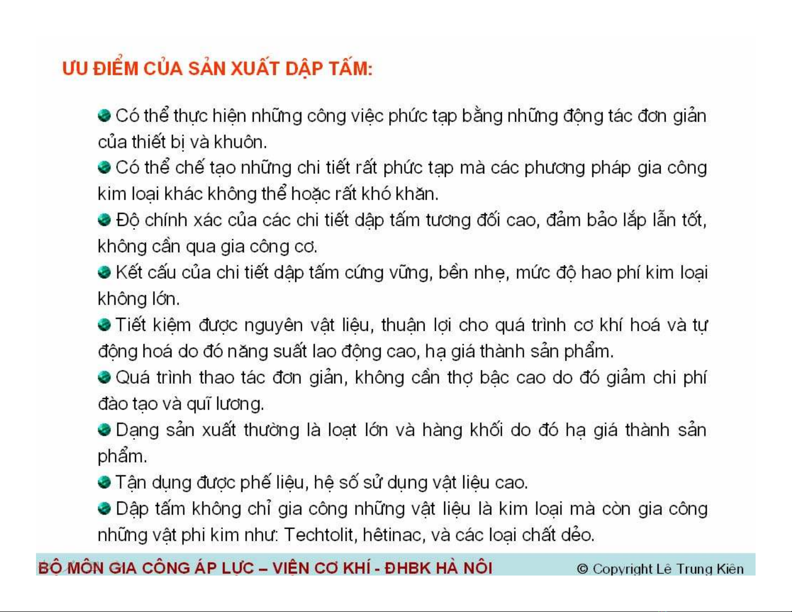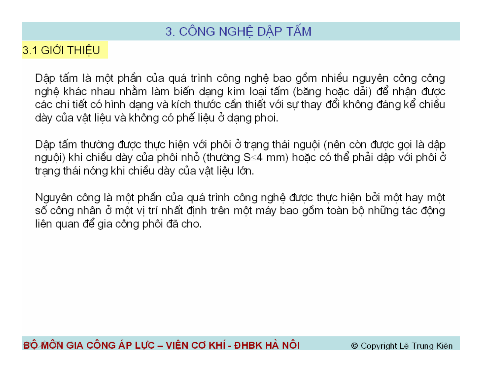 Dập tấm là một phần của quá trình công nghệ bao gồm nhiều nguyên công nghệ khác nhau nhằm làm biến dạng kim loại tấm( băng hoặc dải để nhận được các chi tiết có hình dạng và kích thước cần thiết với sự thay đổi không đáng kể chiều dày của vật liệu và không có phế liệu ở dạng phoi.Dập tấm thường được thực hiện với phôi ở trạng thái nguội ( nên còn được gọi là dập nguội)...