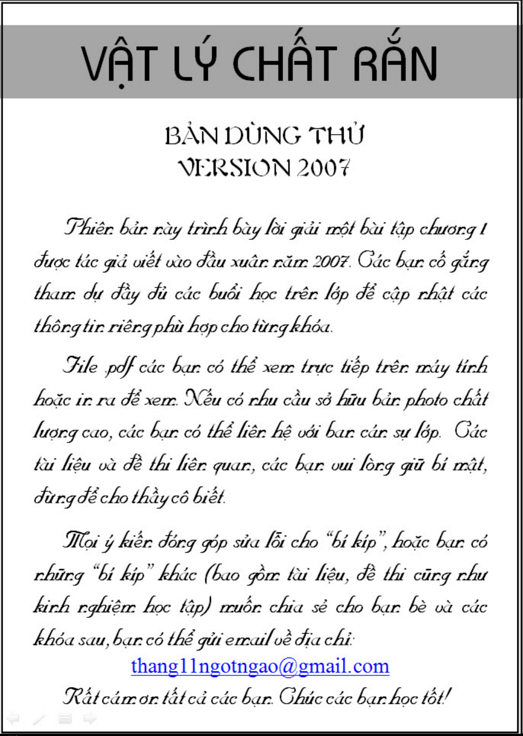 Tài liệu tham khảo Công thức và bài tập Vật lý chất rắn trình bày lời giải bài tập chương 1 dành cho sinh viên chuyên ngành tham khảo và ôn tập tốt hơn.