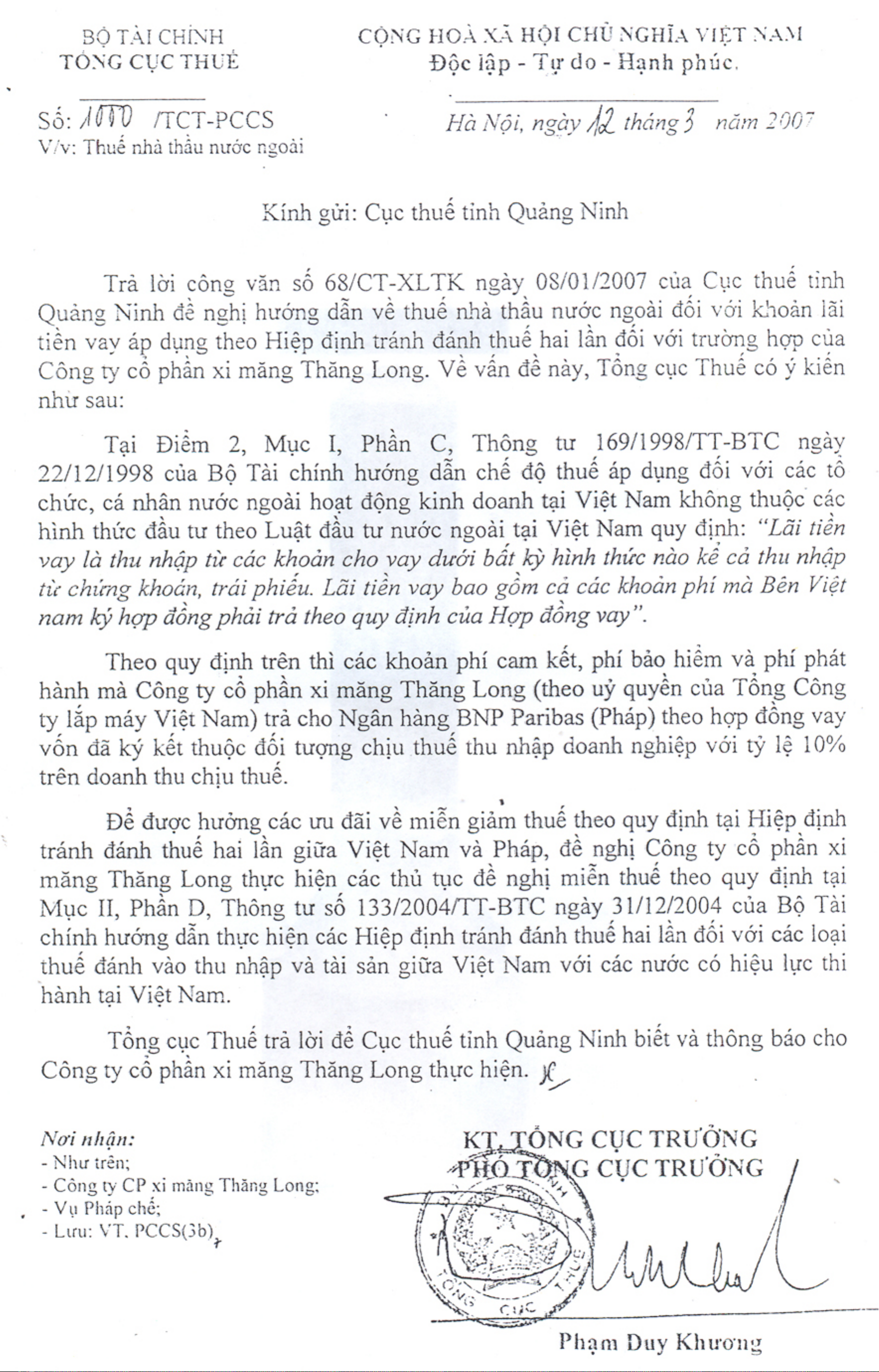 Công văn 1000/TCT-PCCS của Tổng cục Thuế về việc thuế nhà thầu nước ngoài