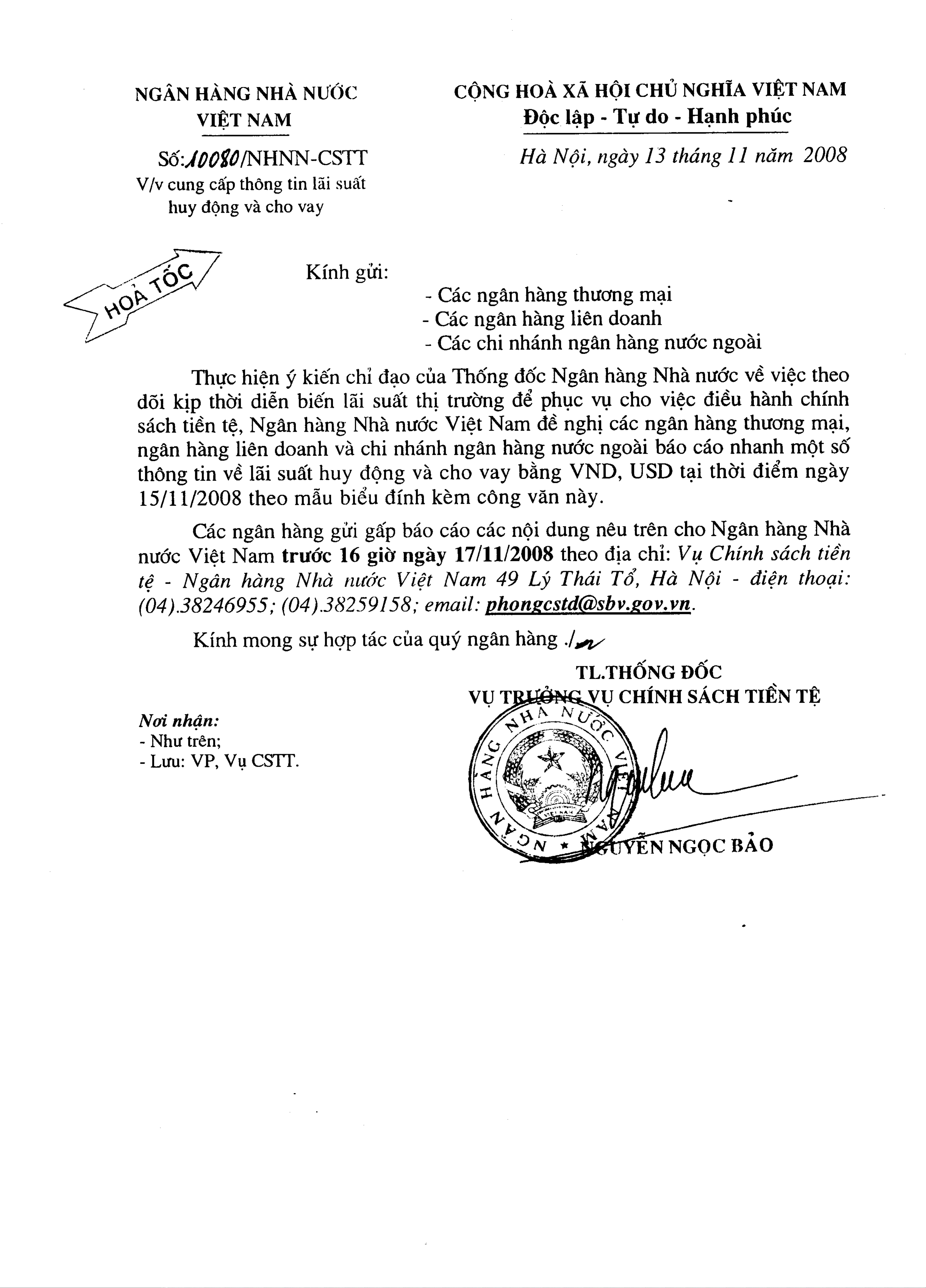 Công văn 10080/NHNN-CSTT của Ngân hàng Nhà nước về việc cung cấp thông tin lãi suất huy động và cho vay