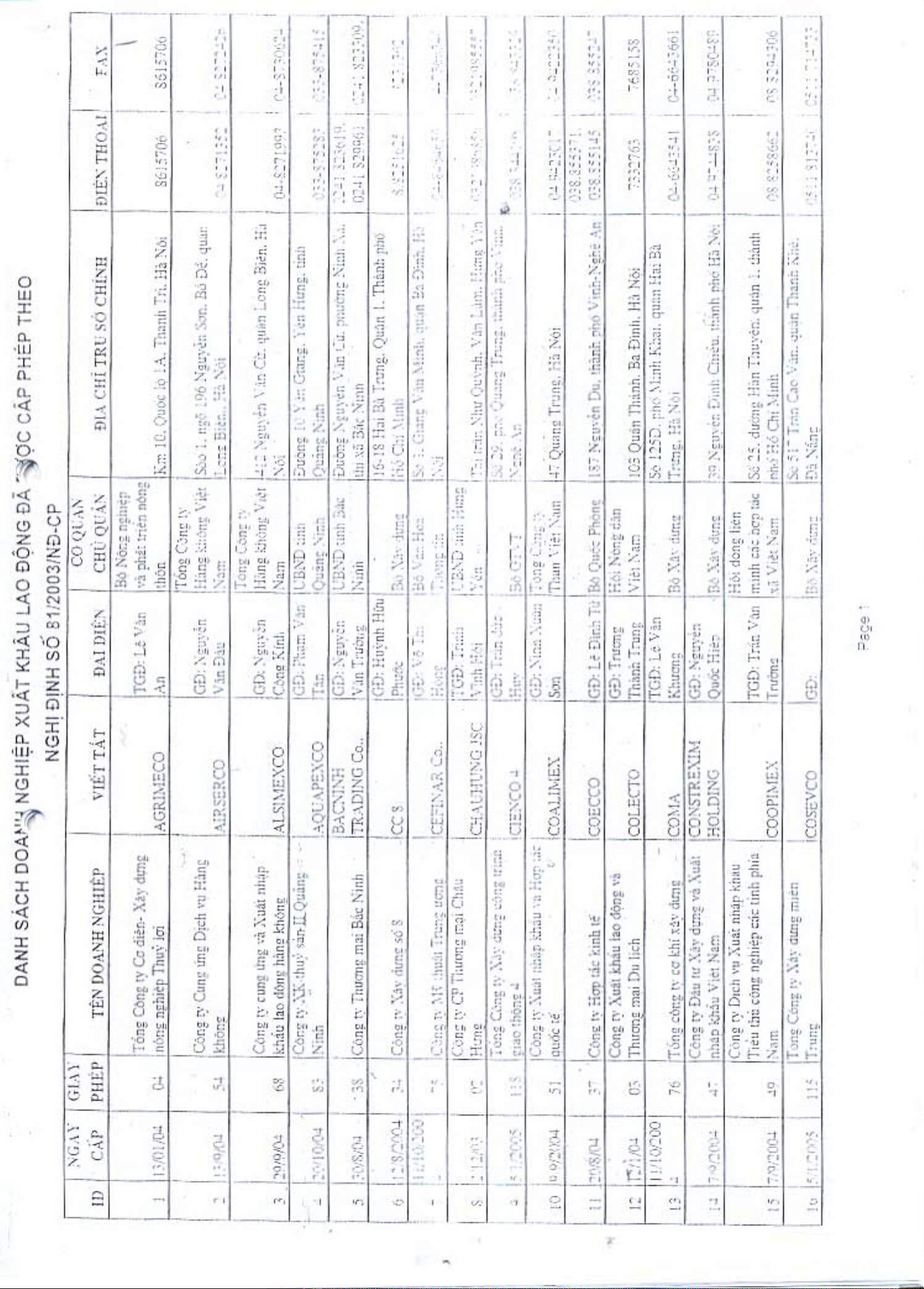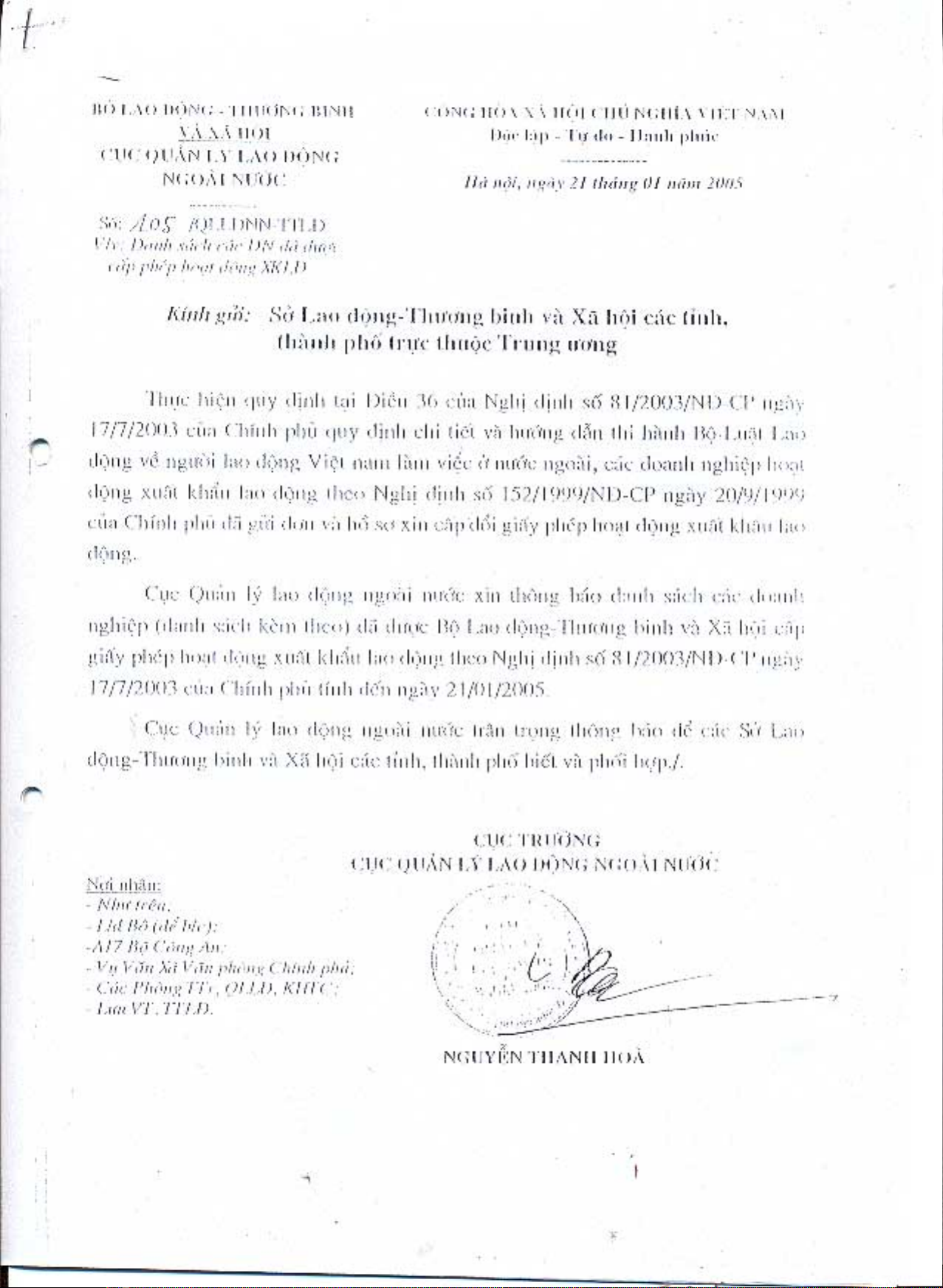 Công văn 105/QLLĐNN/TTLĐ của Bộ Lao Động thương binh và Xã hội về việc danh sách các doanh nghiệp đã được cấp phép hoạt động XKLĐ