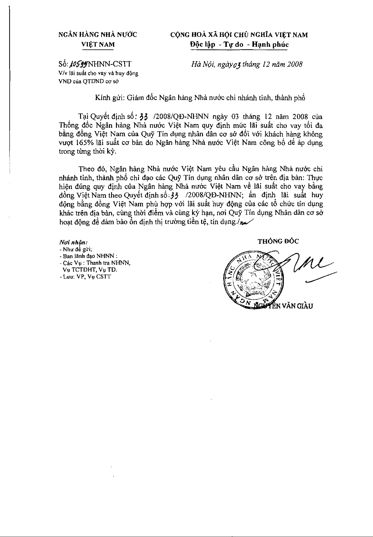 Công văn 10599/NHNN-CSTT của Ngân hàng Nhà nước về việc lãi suất cho vay và huy động Việt Nam đồng của Quỹ Tín dụng nhân dân cơ sở