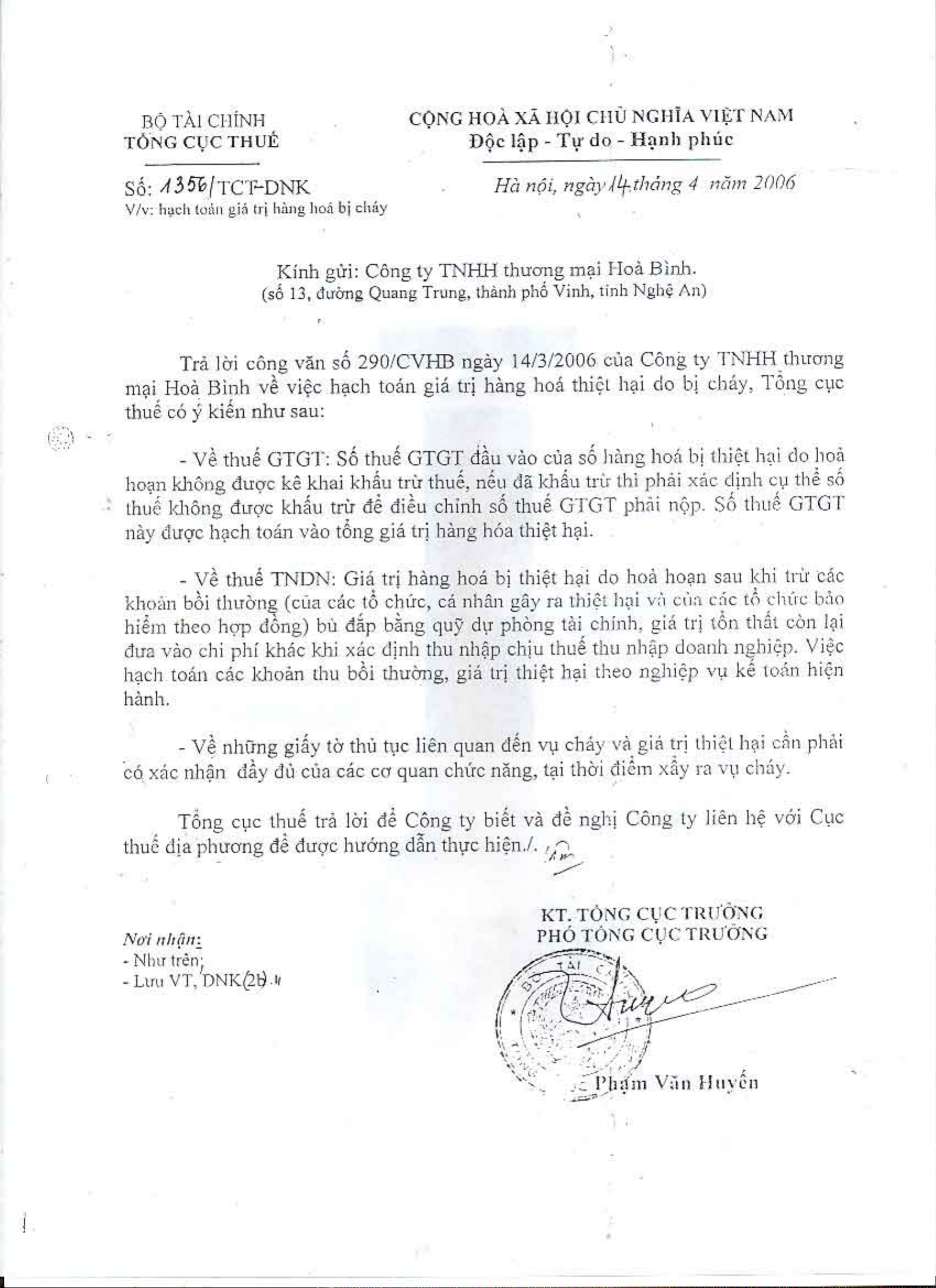 Công văn 1356/TCT-DNK của Tổng cục Thuế về việc hạch toán giá trị hàng hoá bị cháy