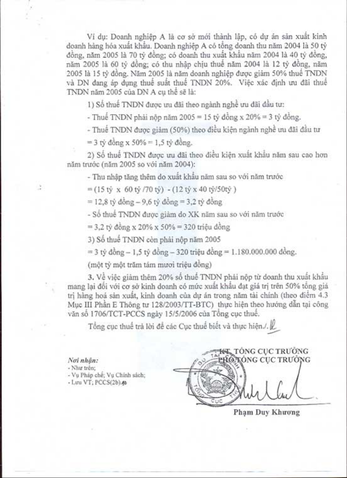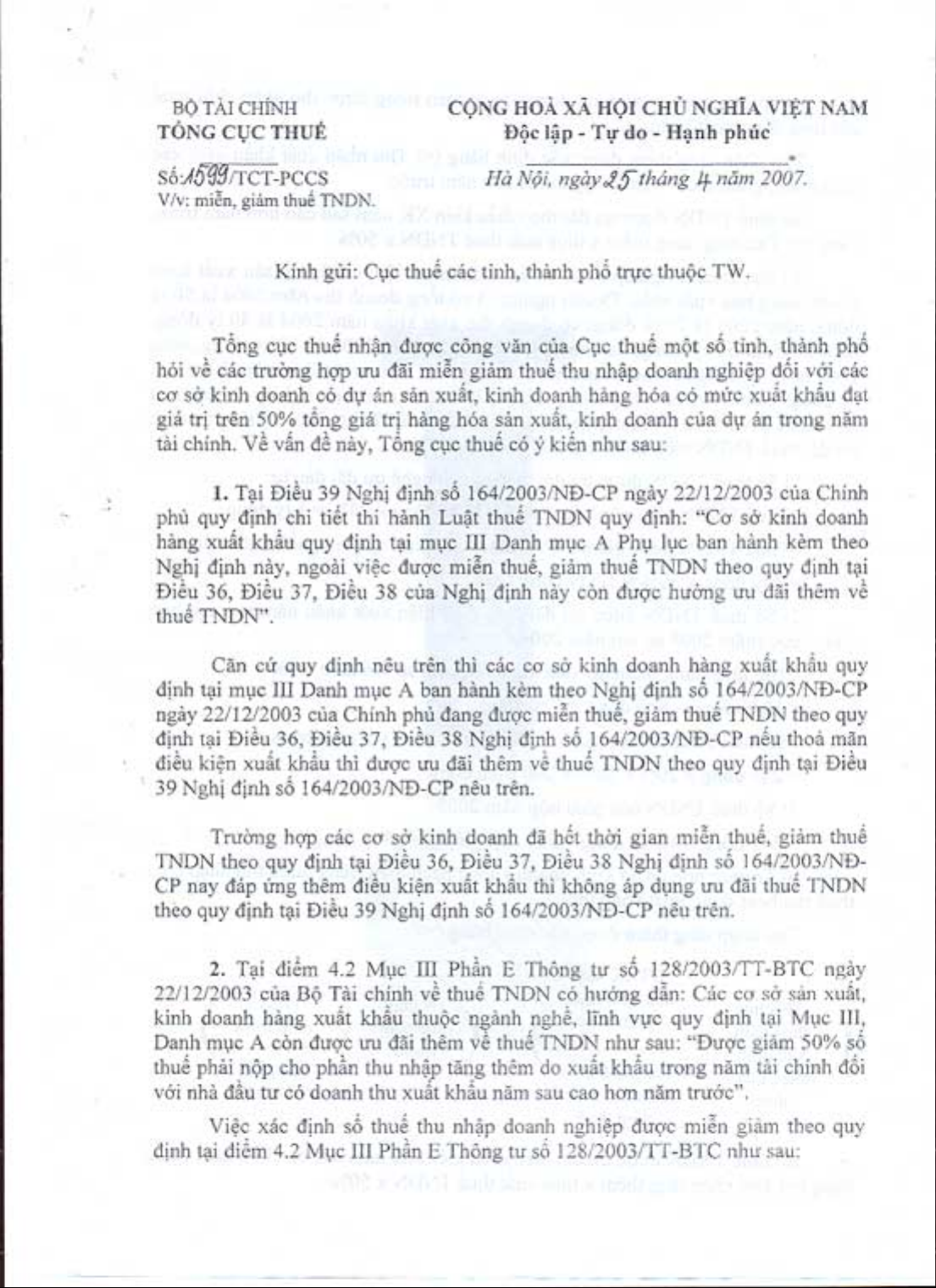 Công văn 1599/TCT-PCCS của Tổng cục Thuế về miễn, giảm thuế Thu nhập doanh nghiệp