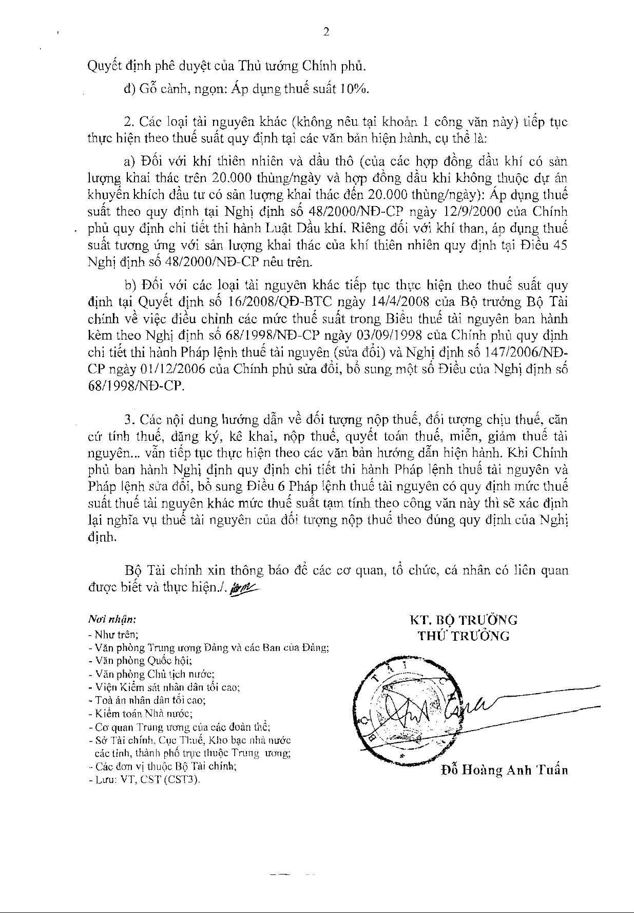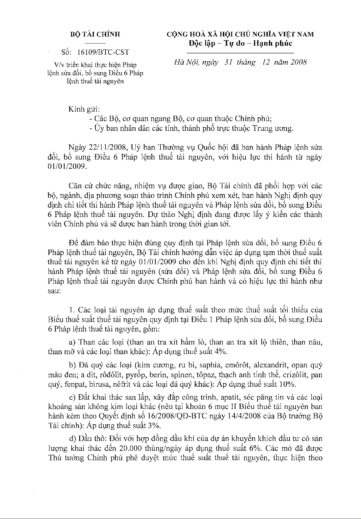 Công văn 16109/BTC-CST của Bộ Tài chính về việc triển khai thực hiện Pháp lệnh sửa đổi, bổ sung Điều 6 Pháp lệnh Thuế tài nguyên