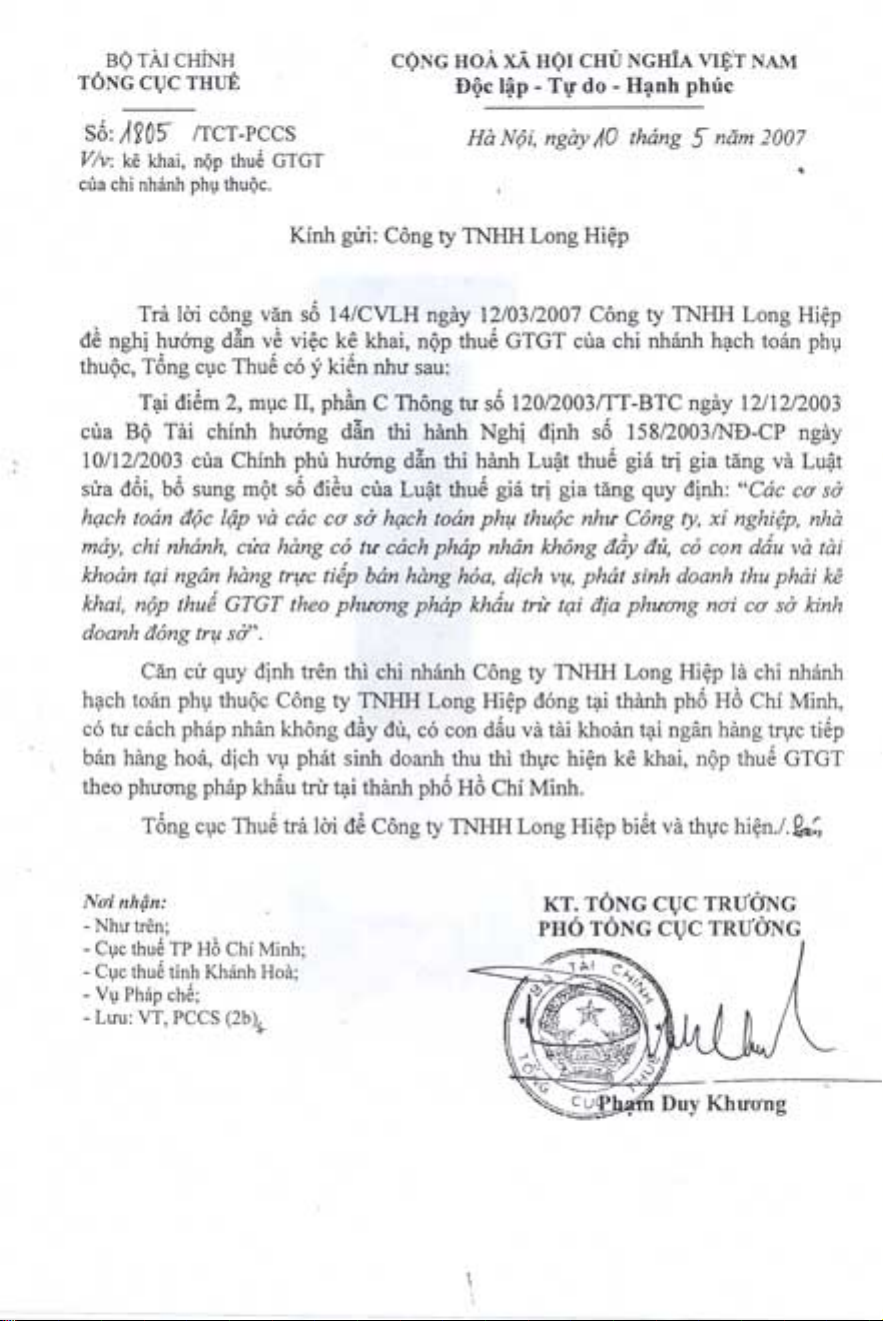 Công văn 1805/TCT-PCCS của Tổng cục Thuế về việc kê khai, nộp thuế GTGT của chi nhánh phụ thuộc