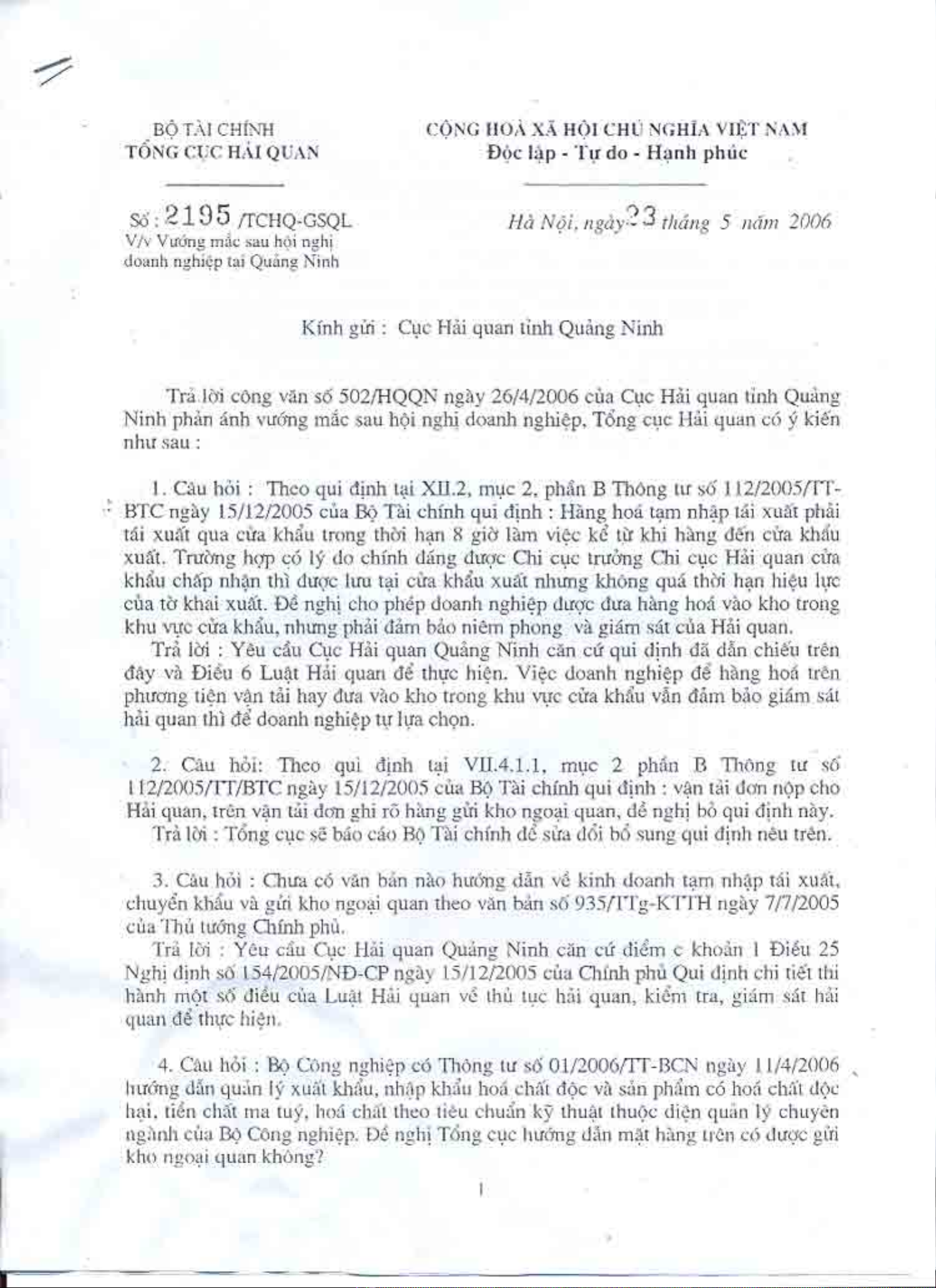 Công văn 2195/TCHQ-GSQL của Tổng cục Hải quan về việc vướng mắc sau hội nghị doanh nghiệp tại Quảng Ninh