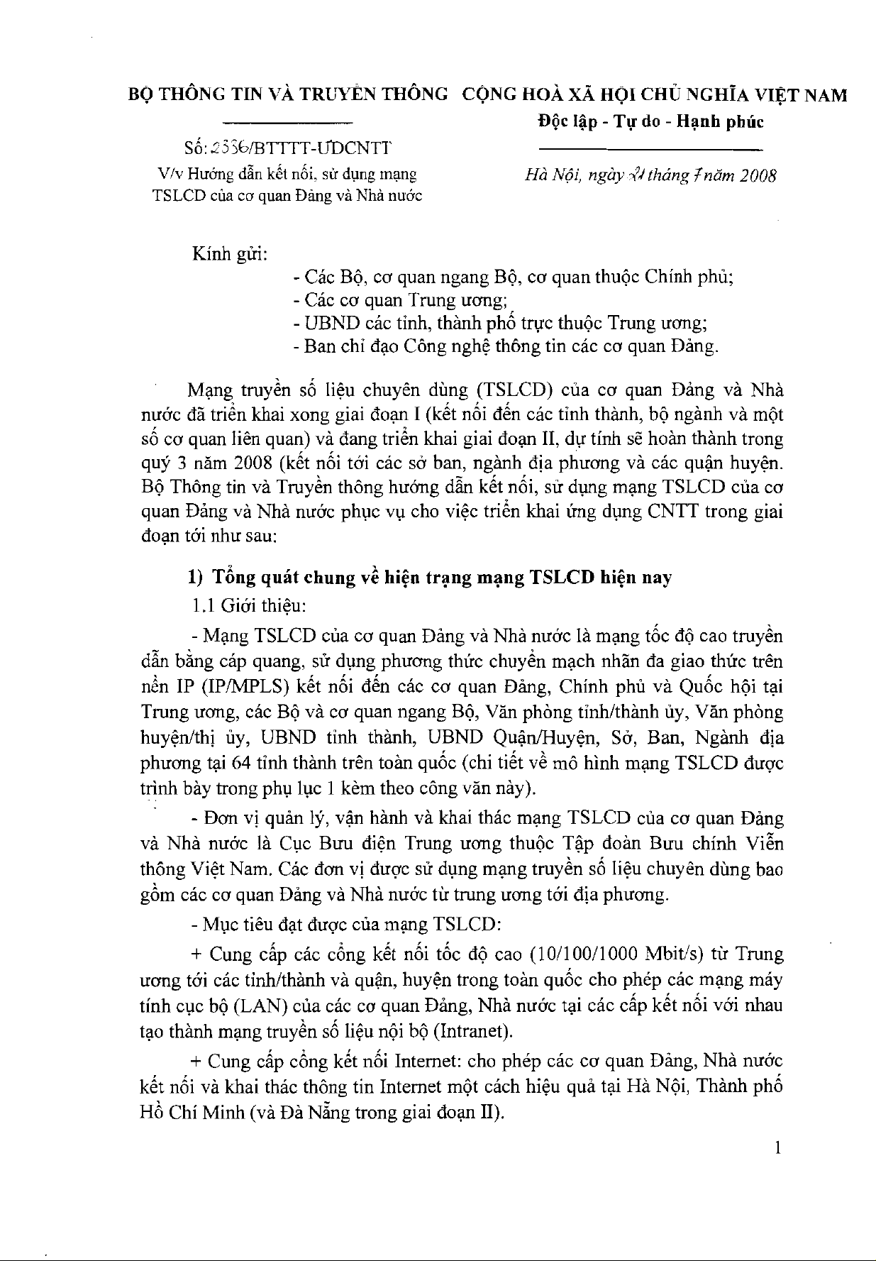 Công văn 2336/BTTTT-ƯDCNTT của Bộ Thông tin và Truyền thông về việc hướng dẫn kết nối, sử dụng mạng truyền số liệu chuyên dùng của cơ quan Đảng và Nhà nước