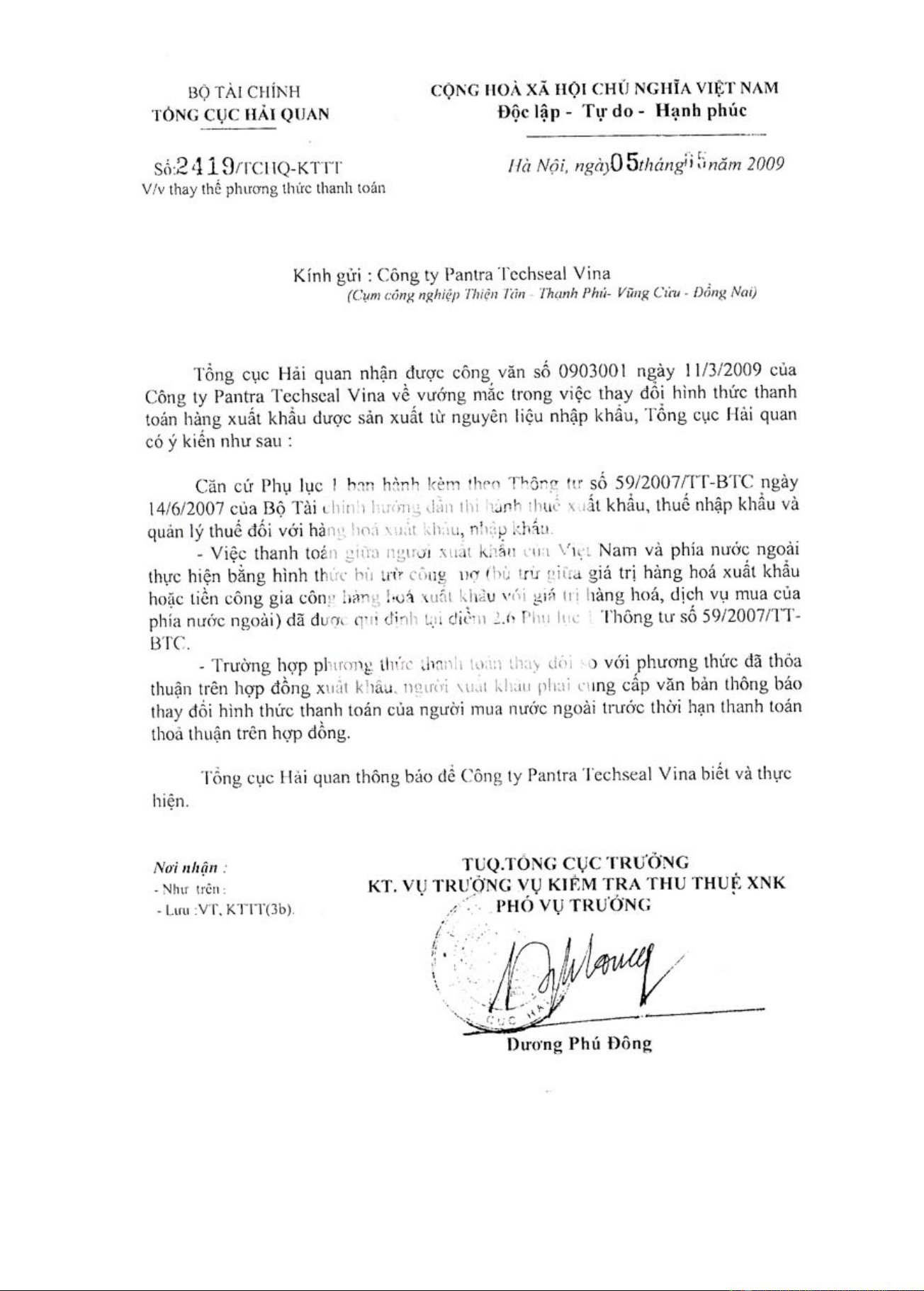 Công văn 2419/TCHQ-KTTT của Tổng cục Hải quan về việc thay thế phương thức thanh toán