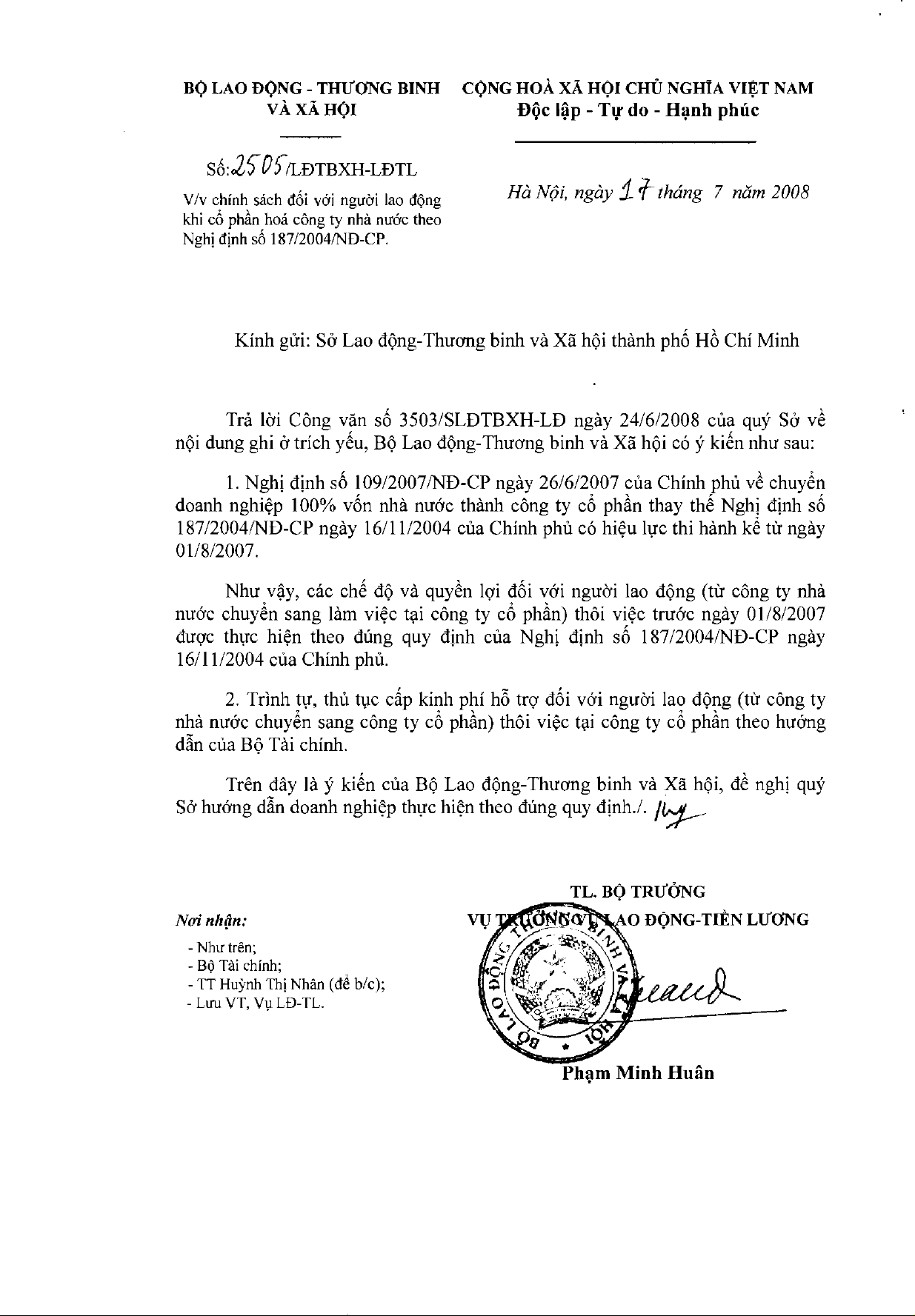 Công văn 2505/LĐTBXH-LĐTL của Bộ Lao động, Thương binh và Xã hội về chính sách đối với người lao động khi cổ phần hóa công ty nhà nước theo Nghị định số 187/2004/NĐ-CP ngày 16/11/2004 của Chính phủ về việc chuyển công ty nhà nước thành công ty cổ phần