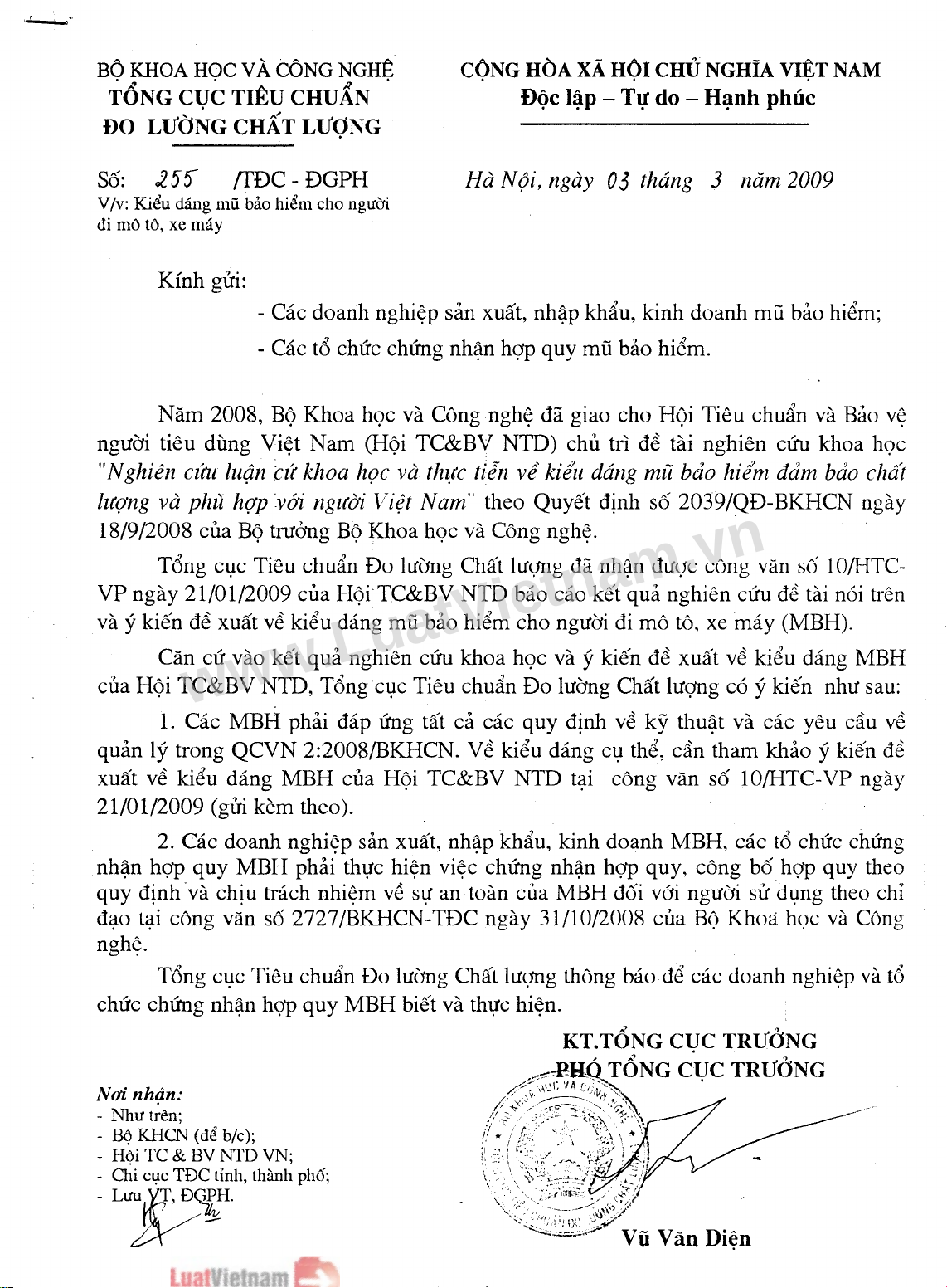 Công văn 255/TĐC-ĐGPH của Tổng cục Tiêu chuẩn Đo lường Chất lượng về việc kiểu dáng mũ bảo hiểm cho người đi mô tô, xe máy