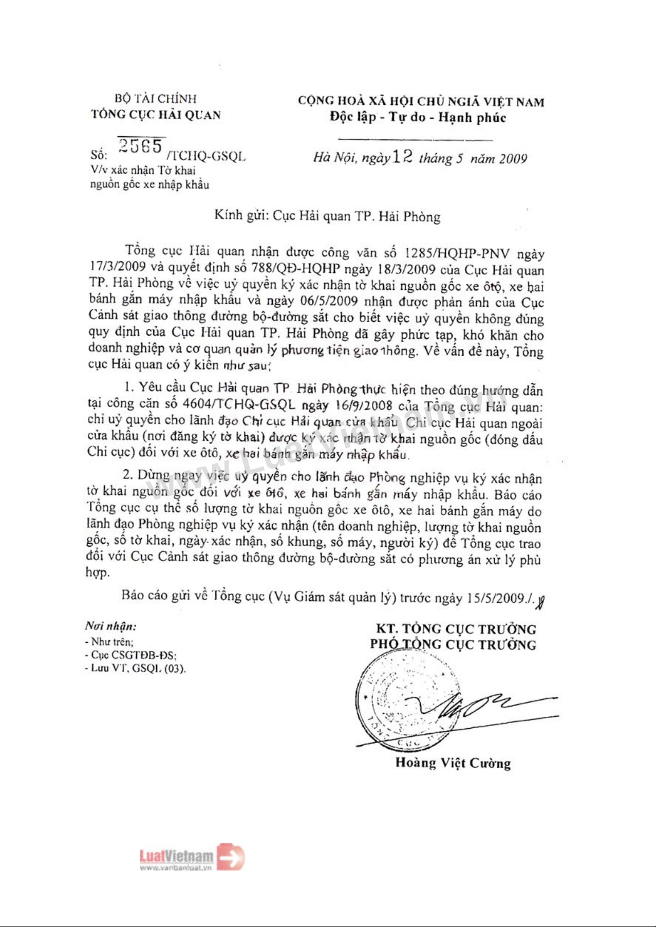 Công văn 2565/TCHQ-GSQL của Tổng cục Hải quan về việc xác nhận Tờ khai nguồn gốc xe nhập khẩu