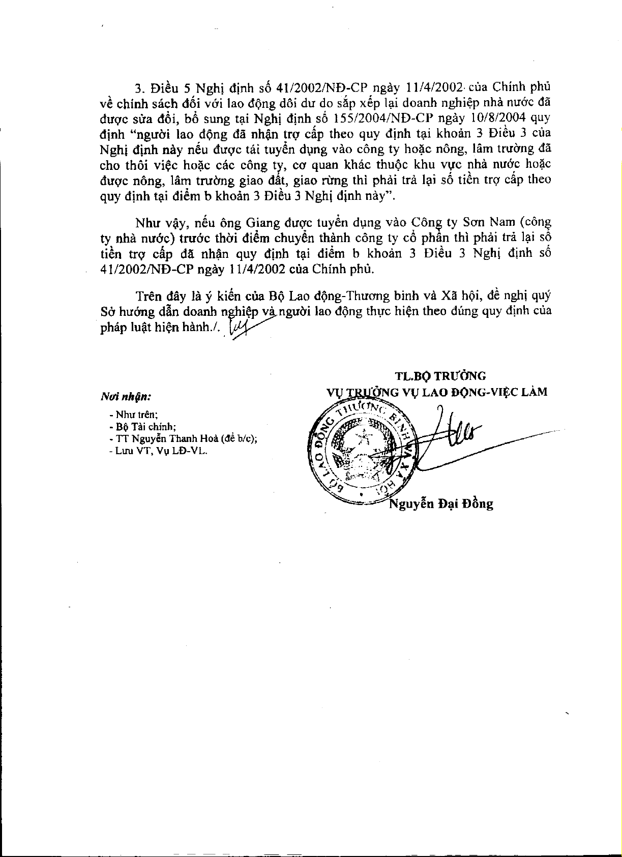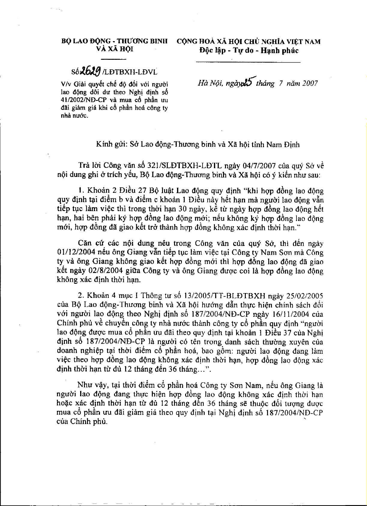 Công văn 2629/LĐTBXH-LĐVL của Bộ Lao động, Thương binh và Xã hội về việc giải quyết chế độ đối với người lao động dôi dư theo Nghị định 41/2002/NĐ-CP và mua cổ phần ưu đãi giảm giá khi cổ phần hoá công ty nhà nước