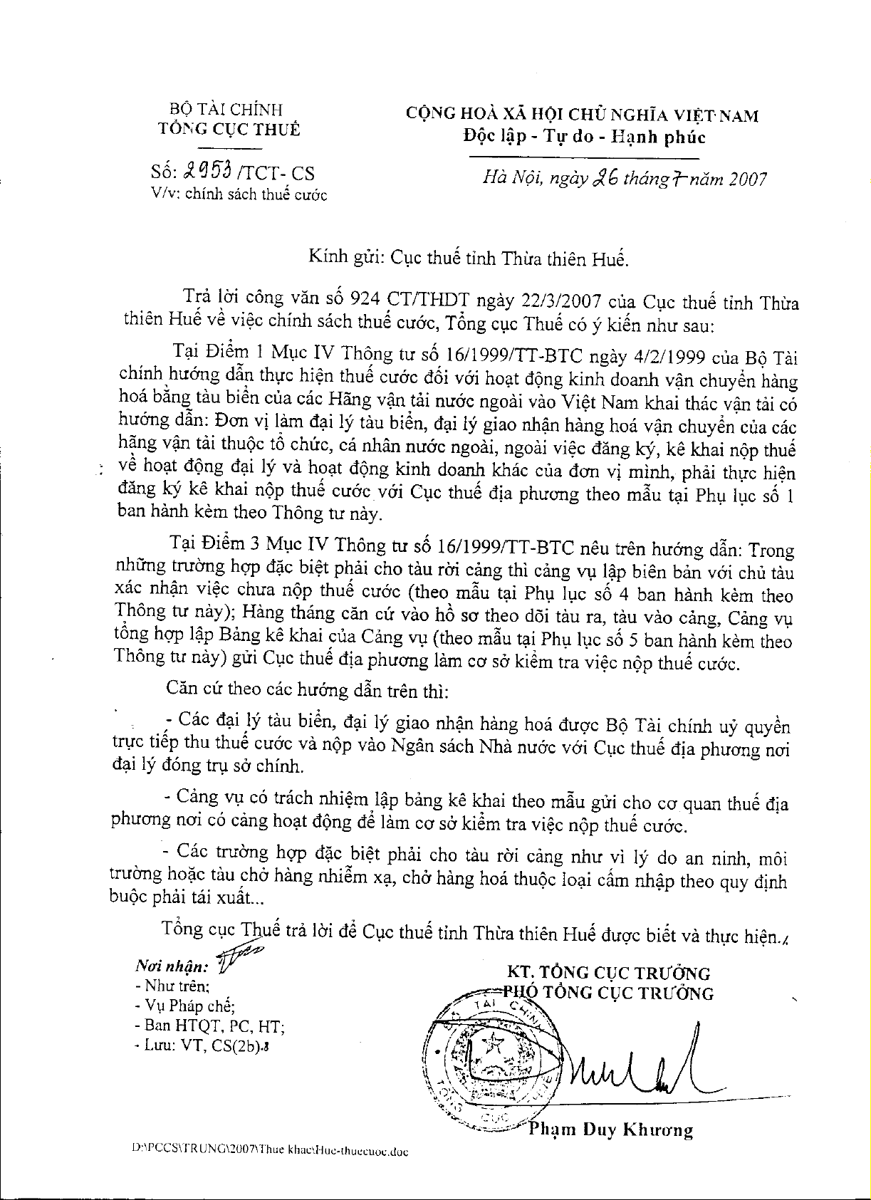 Công văn 2953/TCT-CS của Tổng cục Thuế về việc chính sách thuế cước