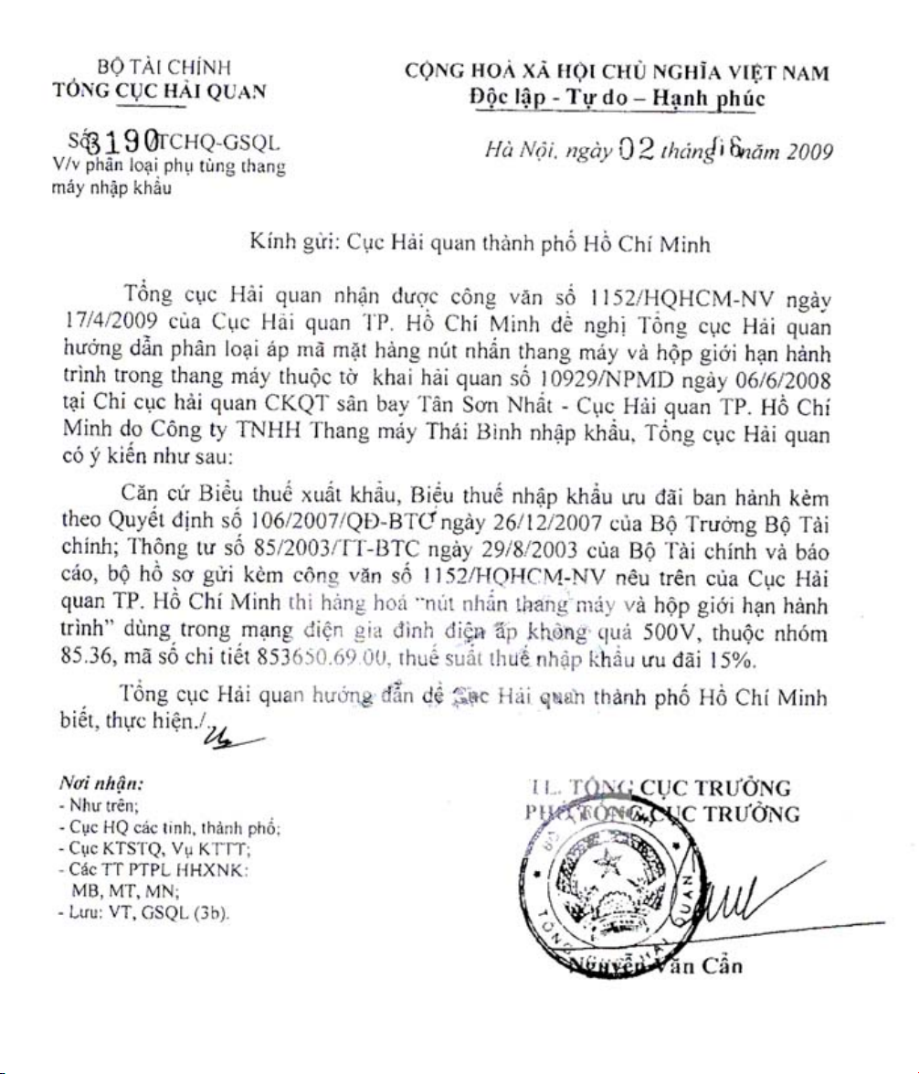 Công văn 3190/TCHQ-GSQL của Tổng cục Hải quan về việc phân loại phụ tùng thang máy nhập khẩu