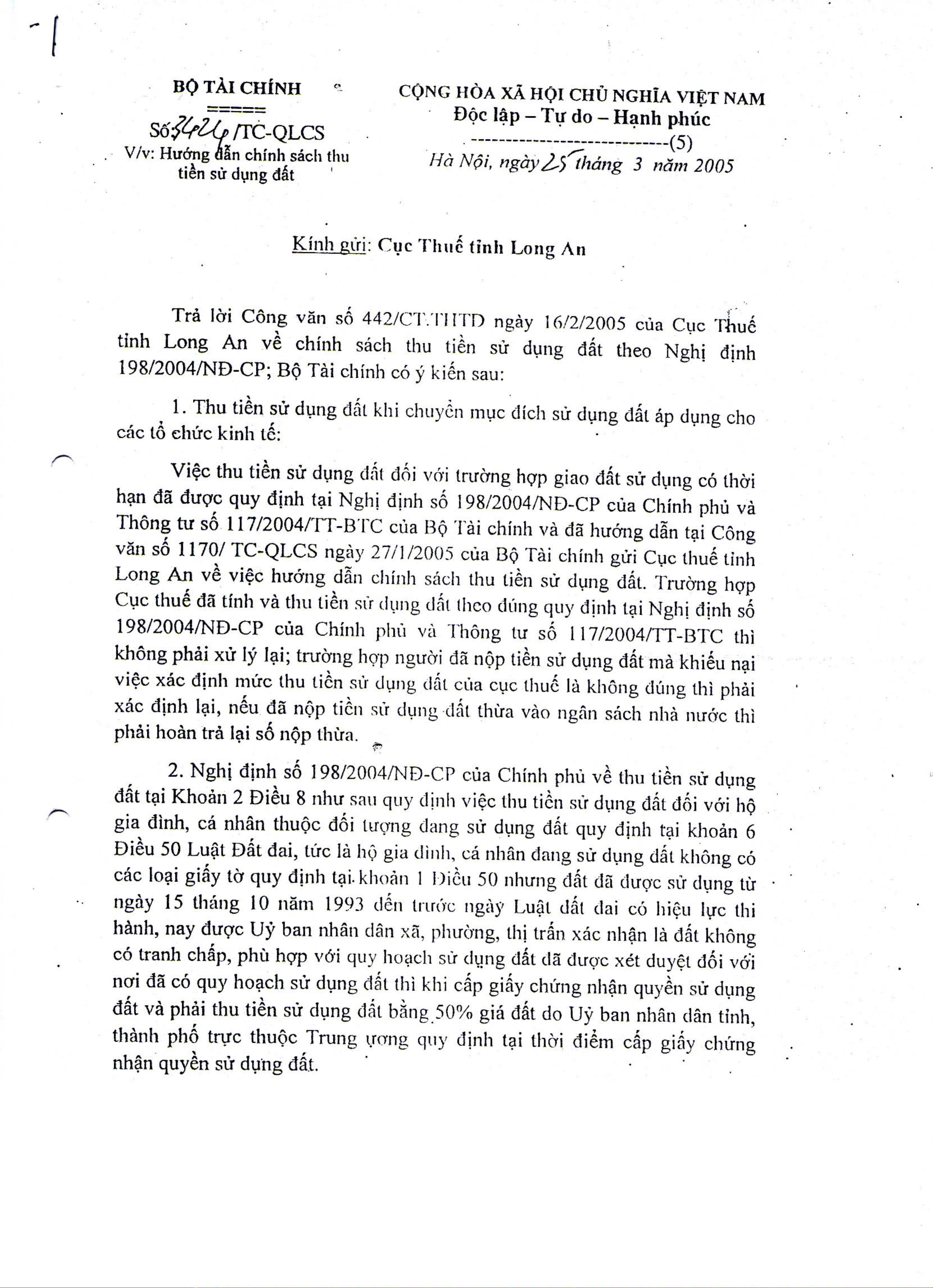 Công văn 3424/TC/QLCS của Bộ Tài chính về việc hướng dẫn chính sách thu tiền sử dụng đất