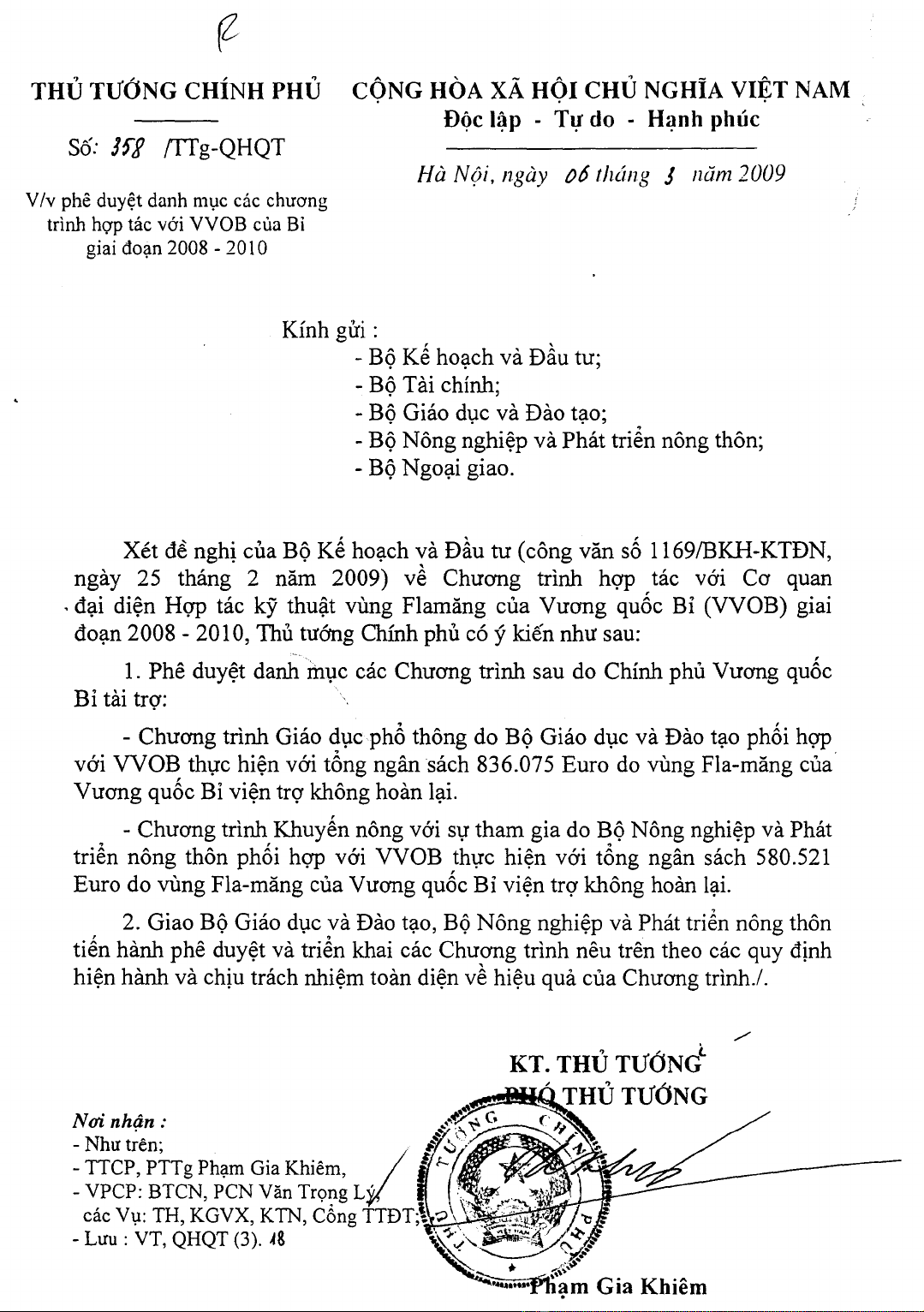 Công văn 358/TTg-QHQT của Thủ tướng Chính phủ về việc phê duyệt danh mục các chương trình hợp tác với VVOB của Bỉ giai đoạn 2008 - 2010