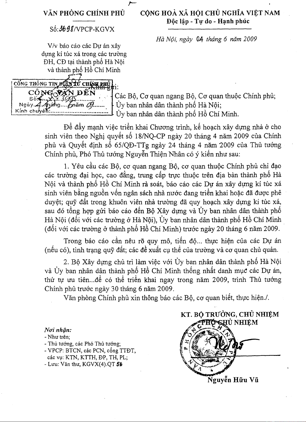 Công văn 3698/VPCP-KGVX của Văn phòng Chính phủ về việc báo cáo các Dự án xây dựng ký túc xá trong các trường đại học, cao đẳng tại Thành phố Hà Nội và Thành phố Hồ Chí Minh