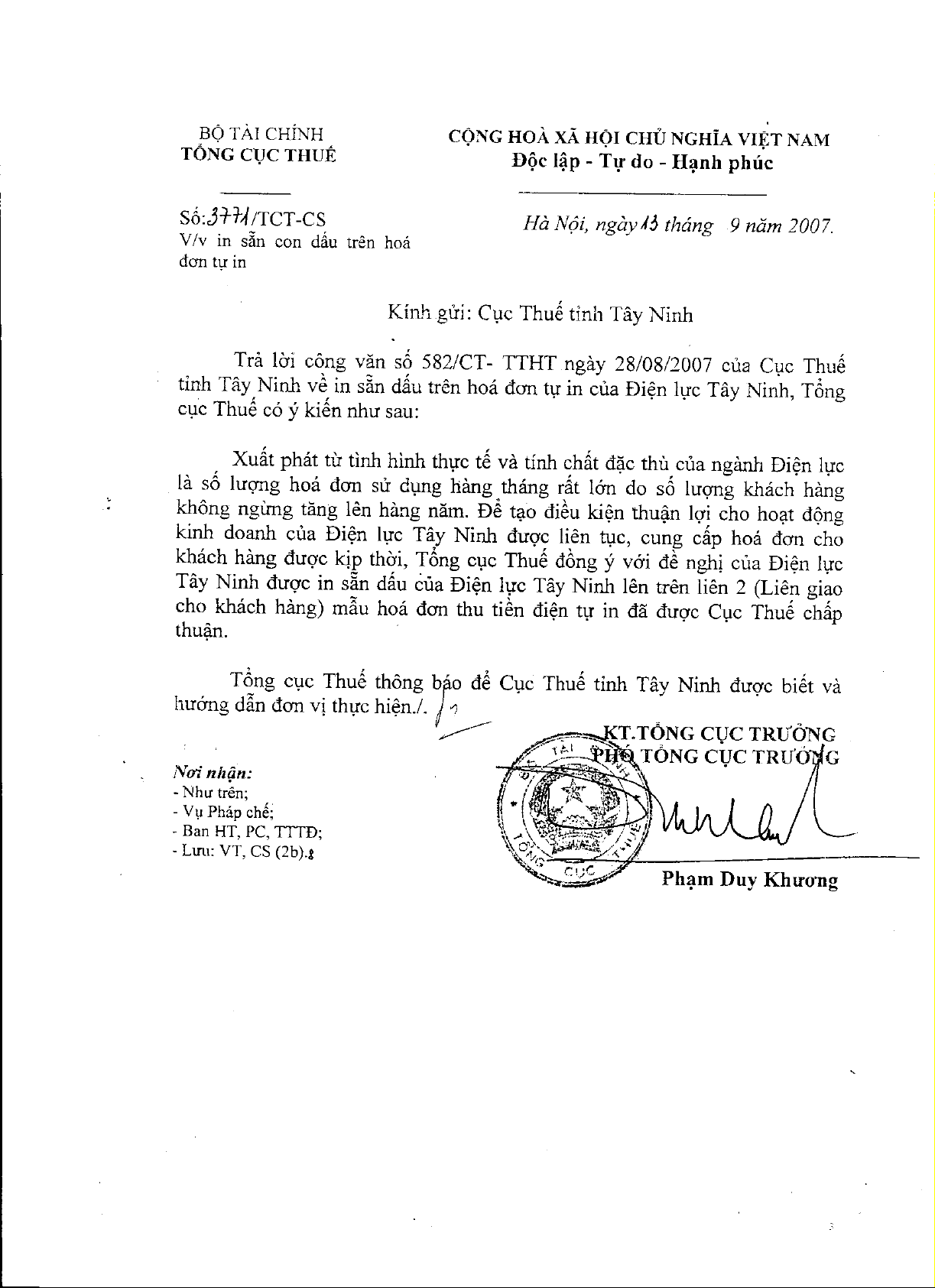 Công văn 3771/TCT-CS của Tổng cục Thuế về việc in sẵn con dấu trên hoá đơn tự in
