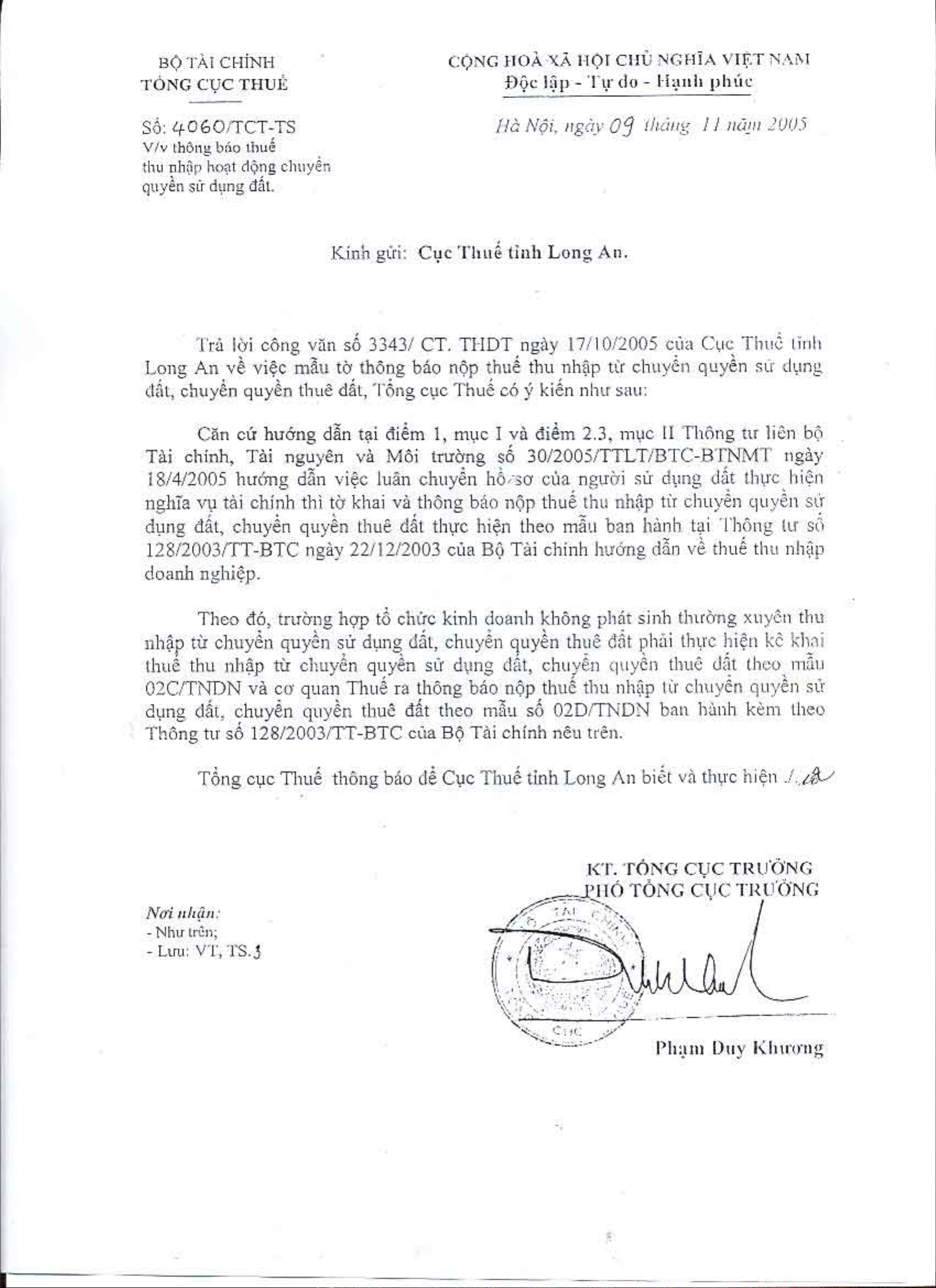 Công văn 4060/TCT-TS của Tổng cục Thuế về việc thông báo thuế thu nhập hoạt động chuyển quyền sử dụng đất