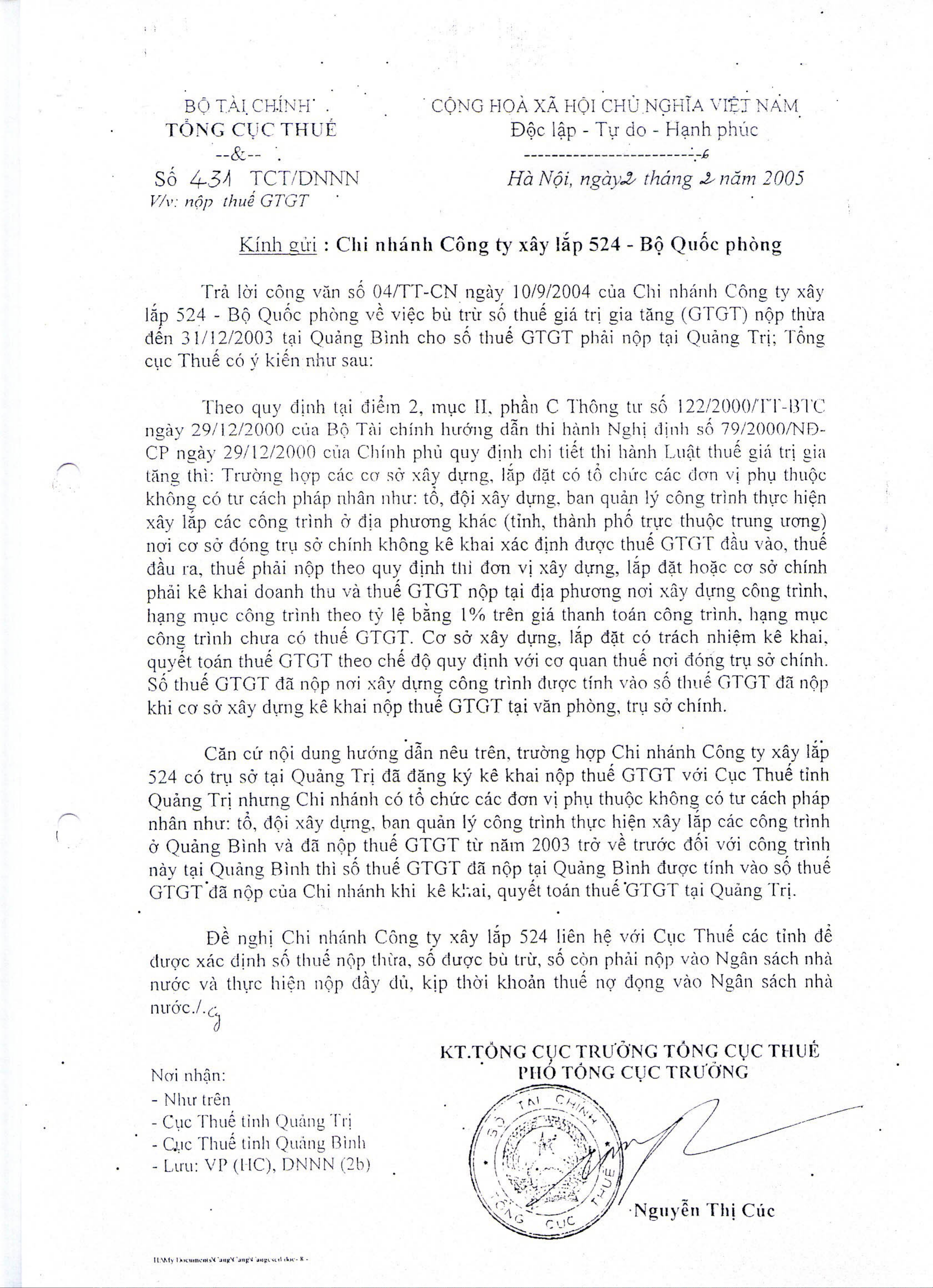 Công văn 431/TCT/DNNN của Tổng cục Thuế về việc nộp thuế GTGT