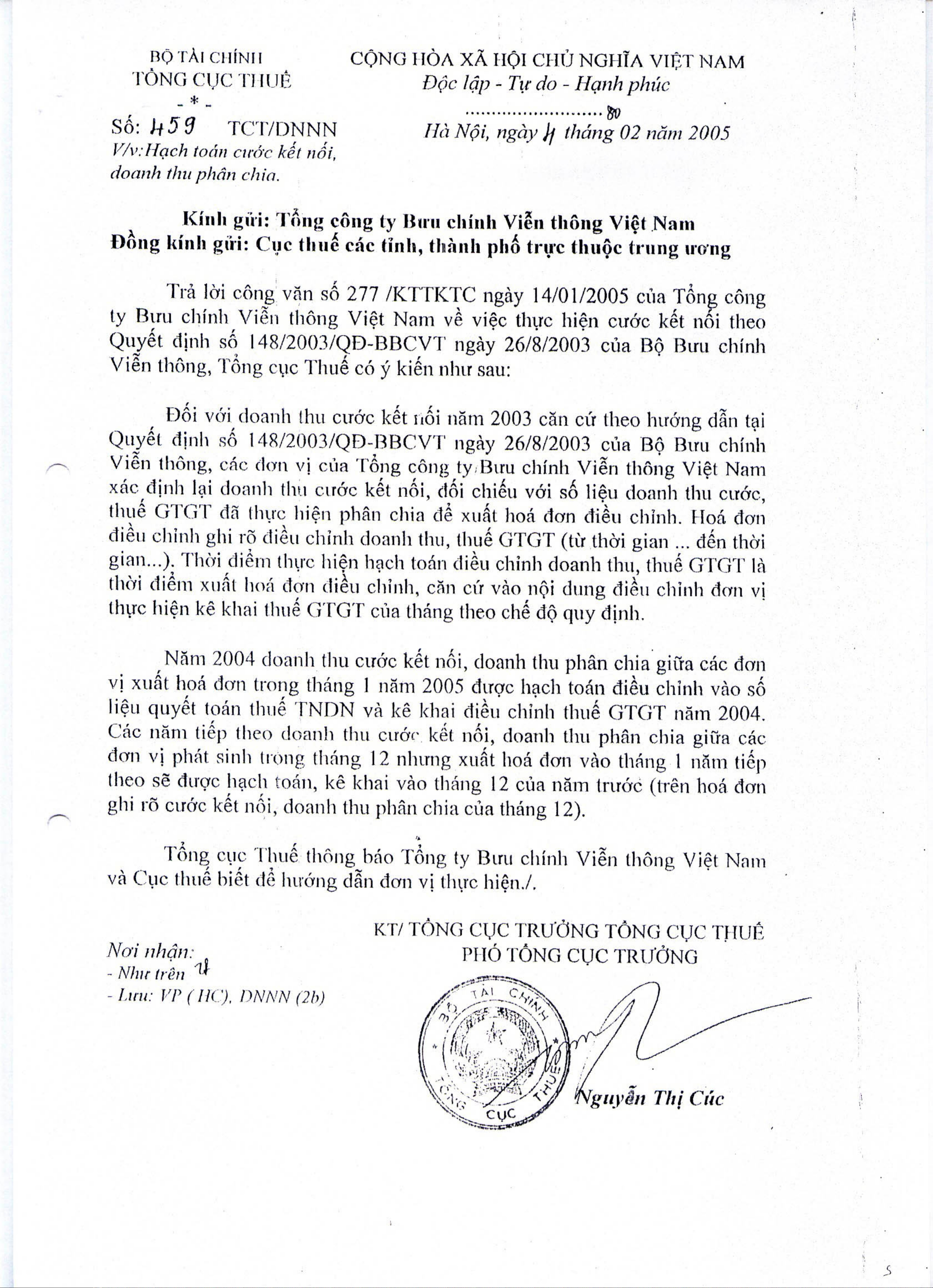 Công văn 459/TCT/DNNN của Tổng cục Thuế về việc hạch toán cước kết nối,doanh thu phân chia