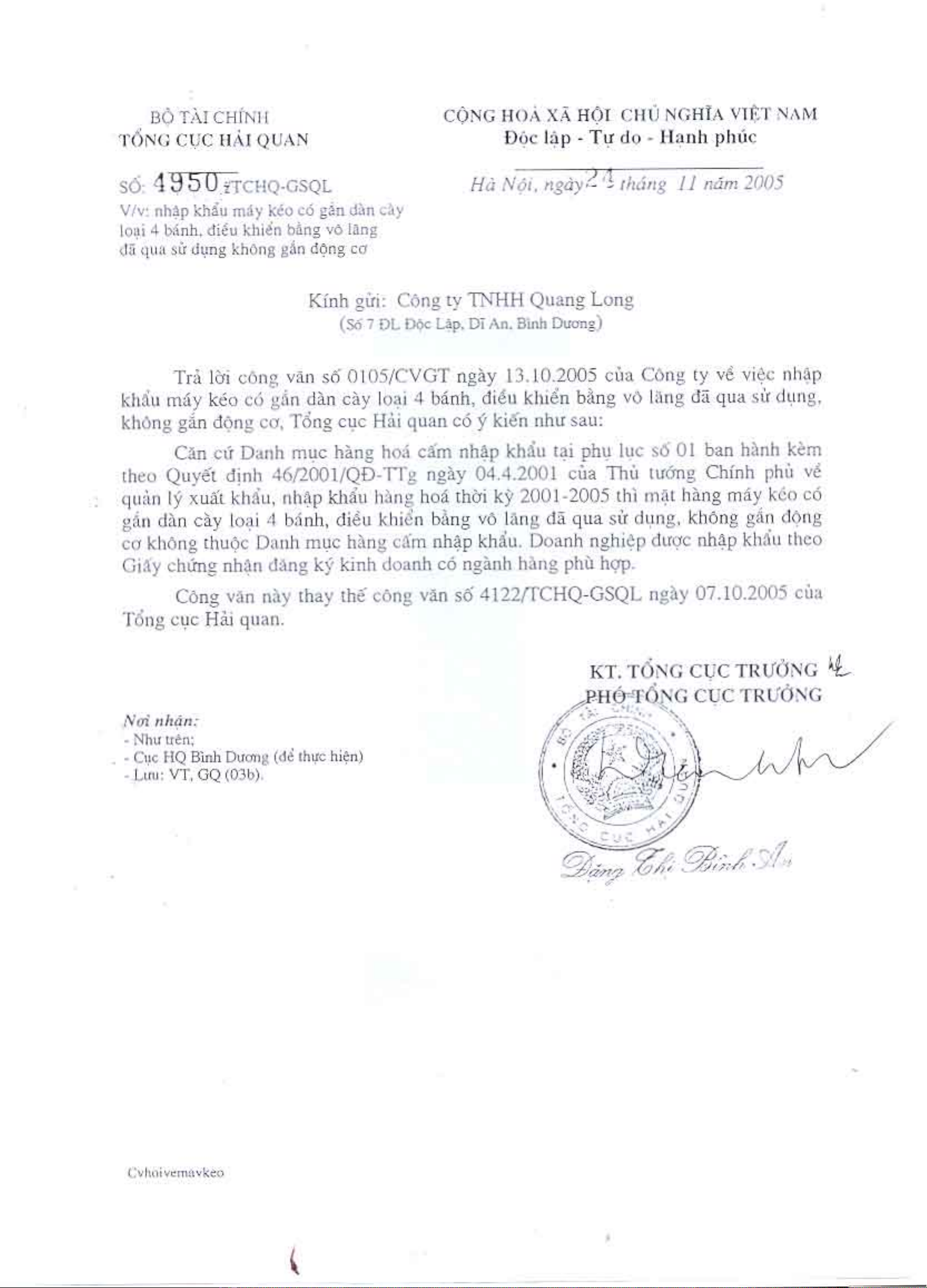 Công văn 4950/TCHQ-GSQL của Tổng cục Hải quan về việc nhập khẩu máu kéo có gắn dàn cày loại 4 bánh, điều khiển bằng vô lăng đã qua sử dụng không gắn động cơ