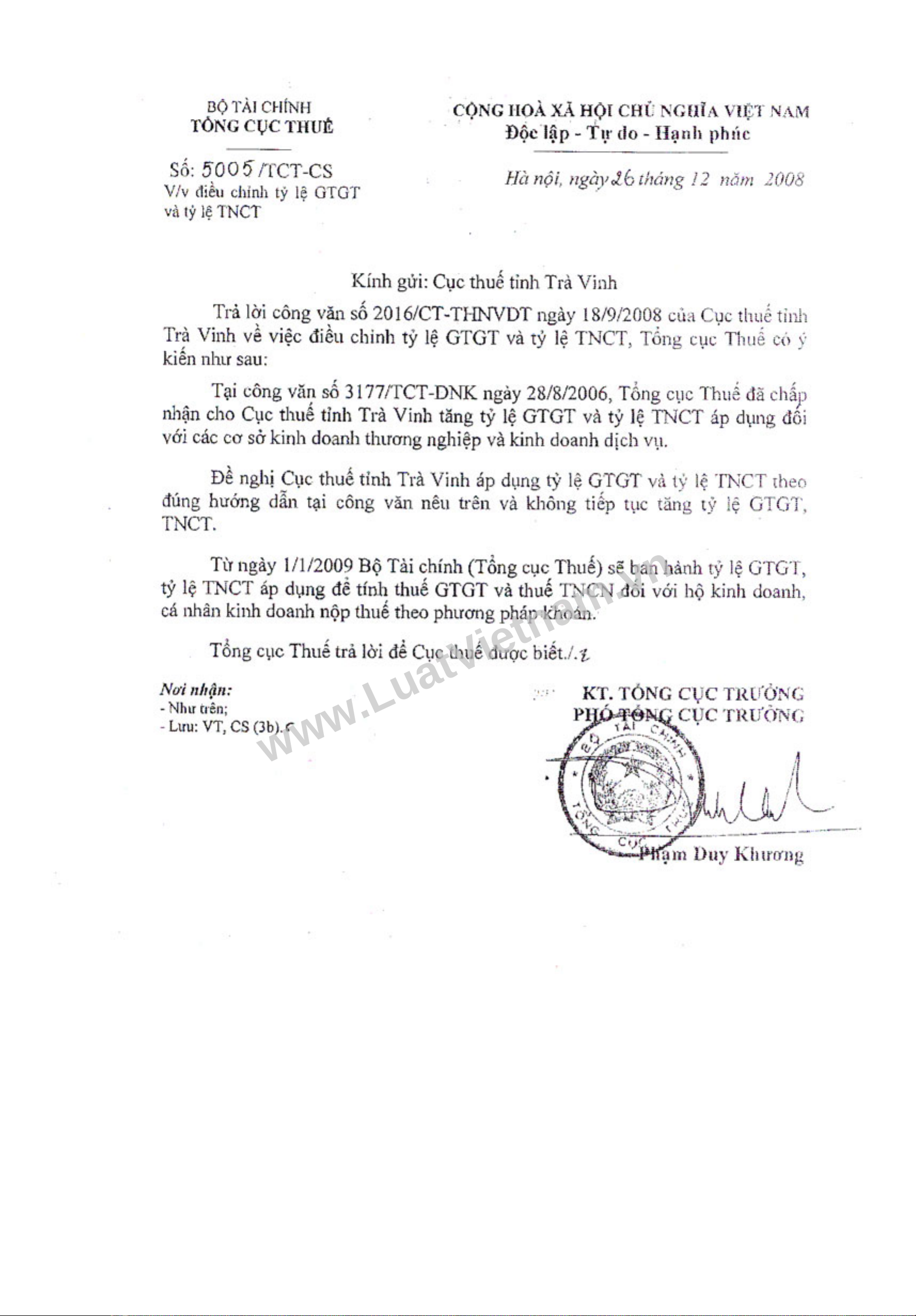 Công văn 5005/TCT-CS của Tổng cục Thuế về việc điều chỉnh tỷ lệ giá trị gia tăng và tỷ lệ thu nhập chịu thuế