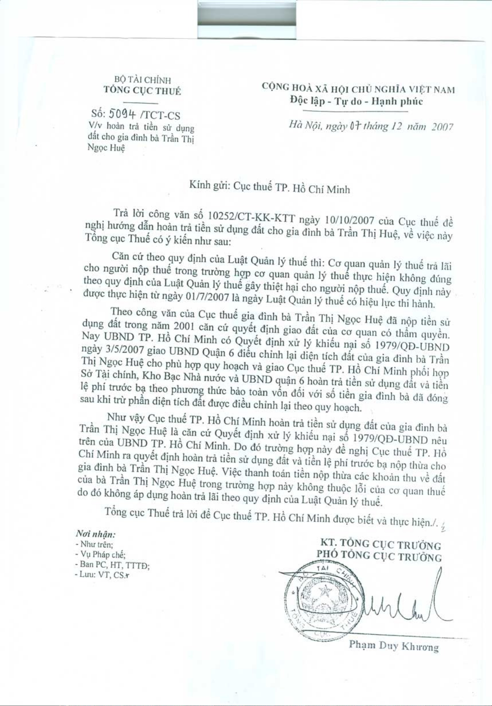Công văn 5094/TCT-CS của Tổng cục Thuế về việc hoàn trả tiền sử dụng đất cho gia đình bà Trần Thị Ngọc Huệ