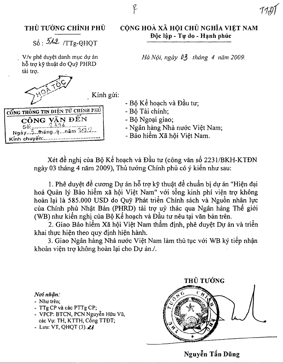 Công văn 512/TTg-QHQT của Thủ tướng Chính phủ về việc phê duyệt danh mục dự án hỗ trợ kỹ thuật do Quỹ Phát triển Chính sách và Nguồn nhân lực của Chính phủ Nhật Bản (PHRD) tài trợ