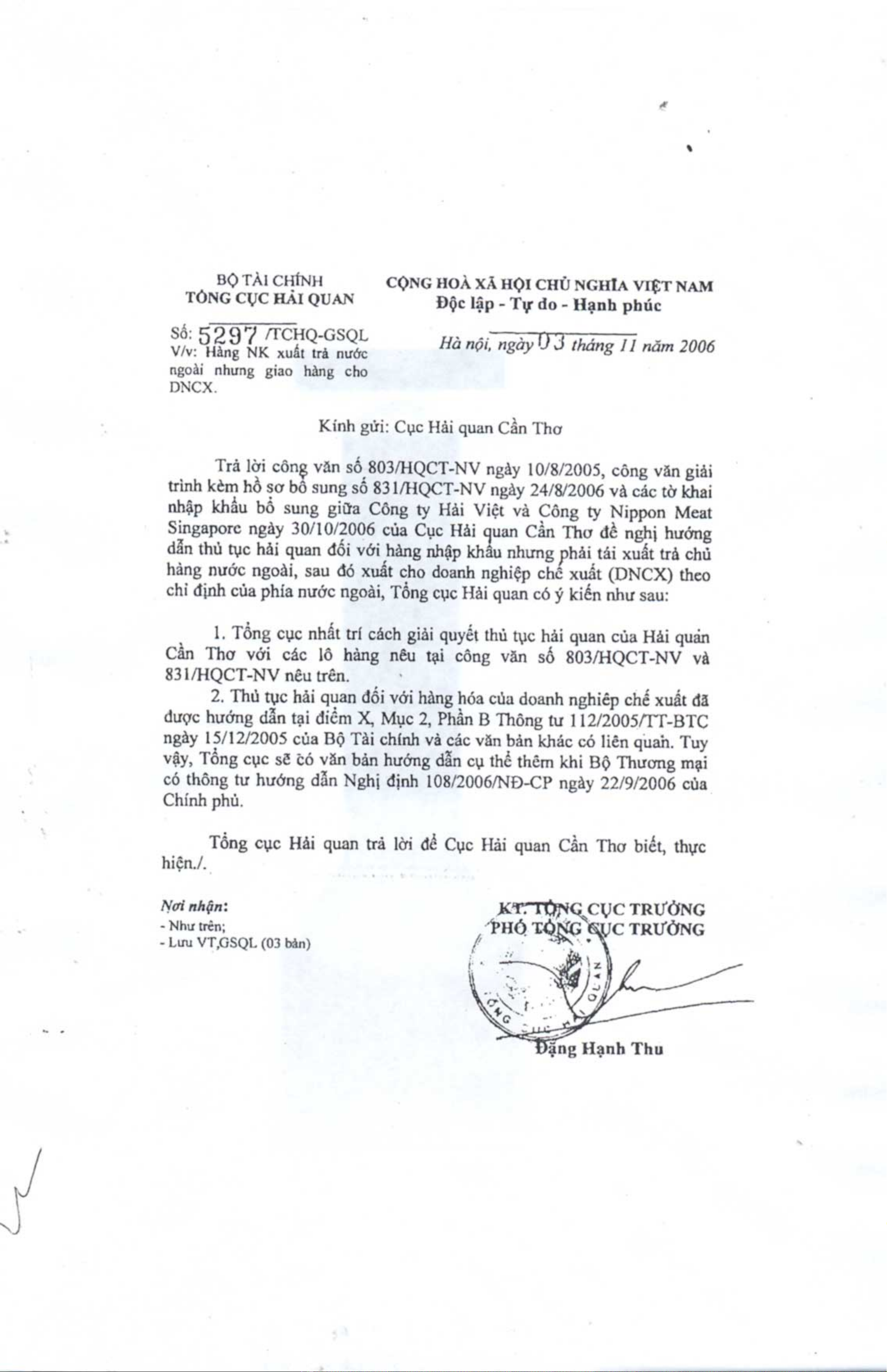 Công văn 5297/TCHQ-GSQL của Tổng cục Hải quan về việc hàng NK xuất trả nước ngoài nhưng giao hàng cho DNCX.