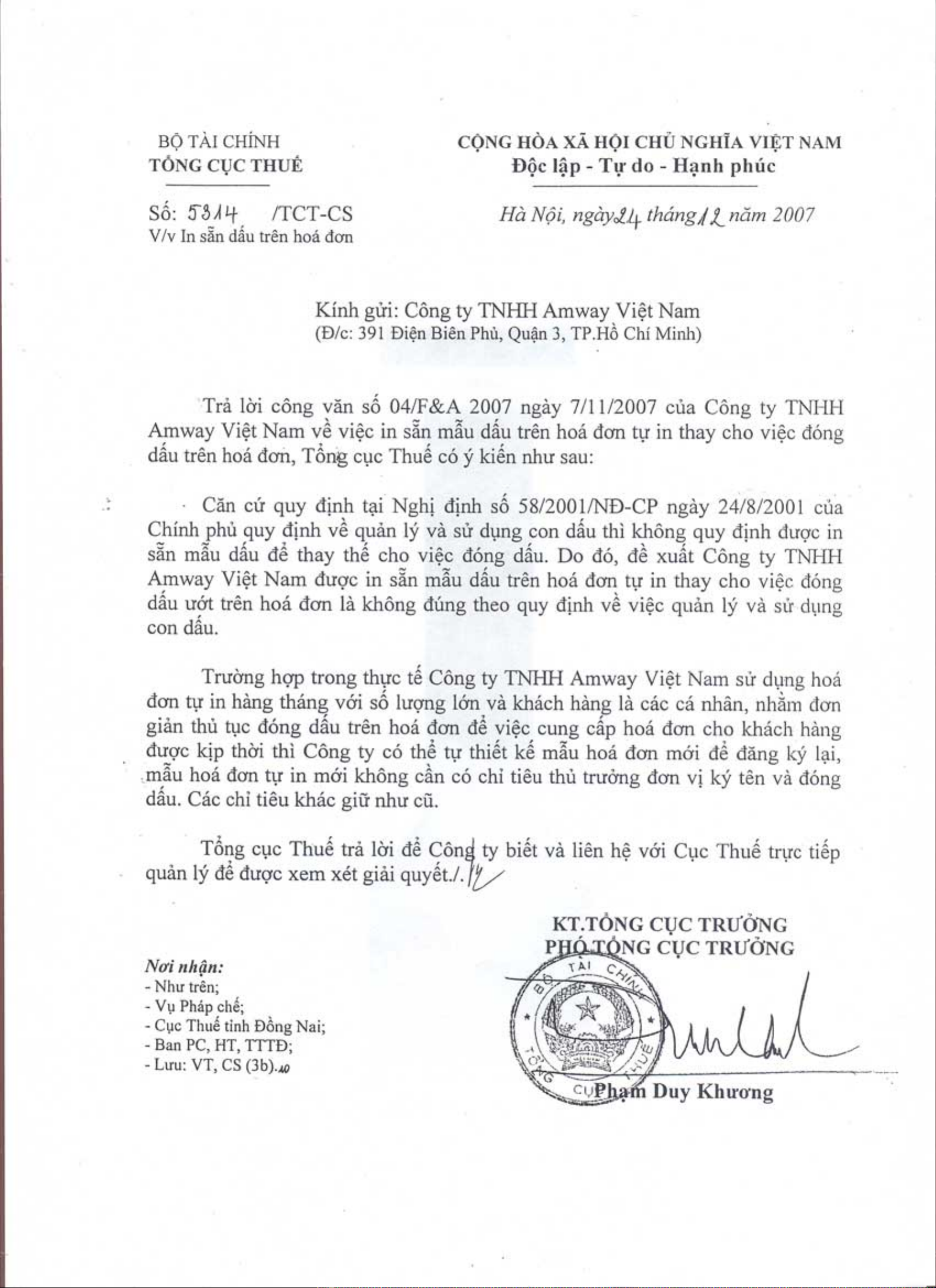 Công văn 5314/TCT-CS của Tổng cục Thuế về việc In sẵn dấu trên hoá đơn