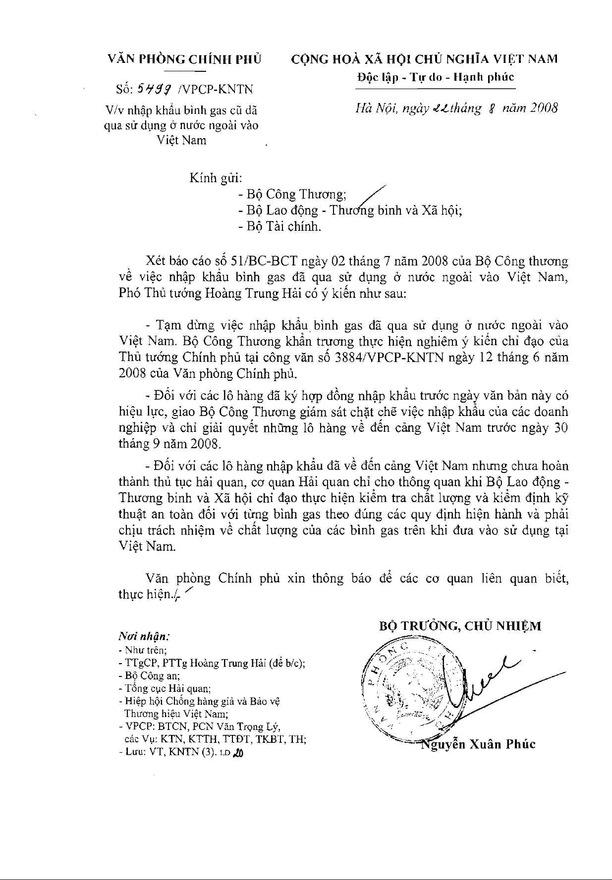 Công văn 5499/VPCP-KNTN của Văn phòng Chính phủ về việc nhập khẩu bình gas cũ đã qua sử dụng ở nước ngoài vào Việt Nam