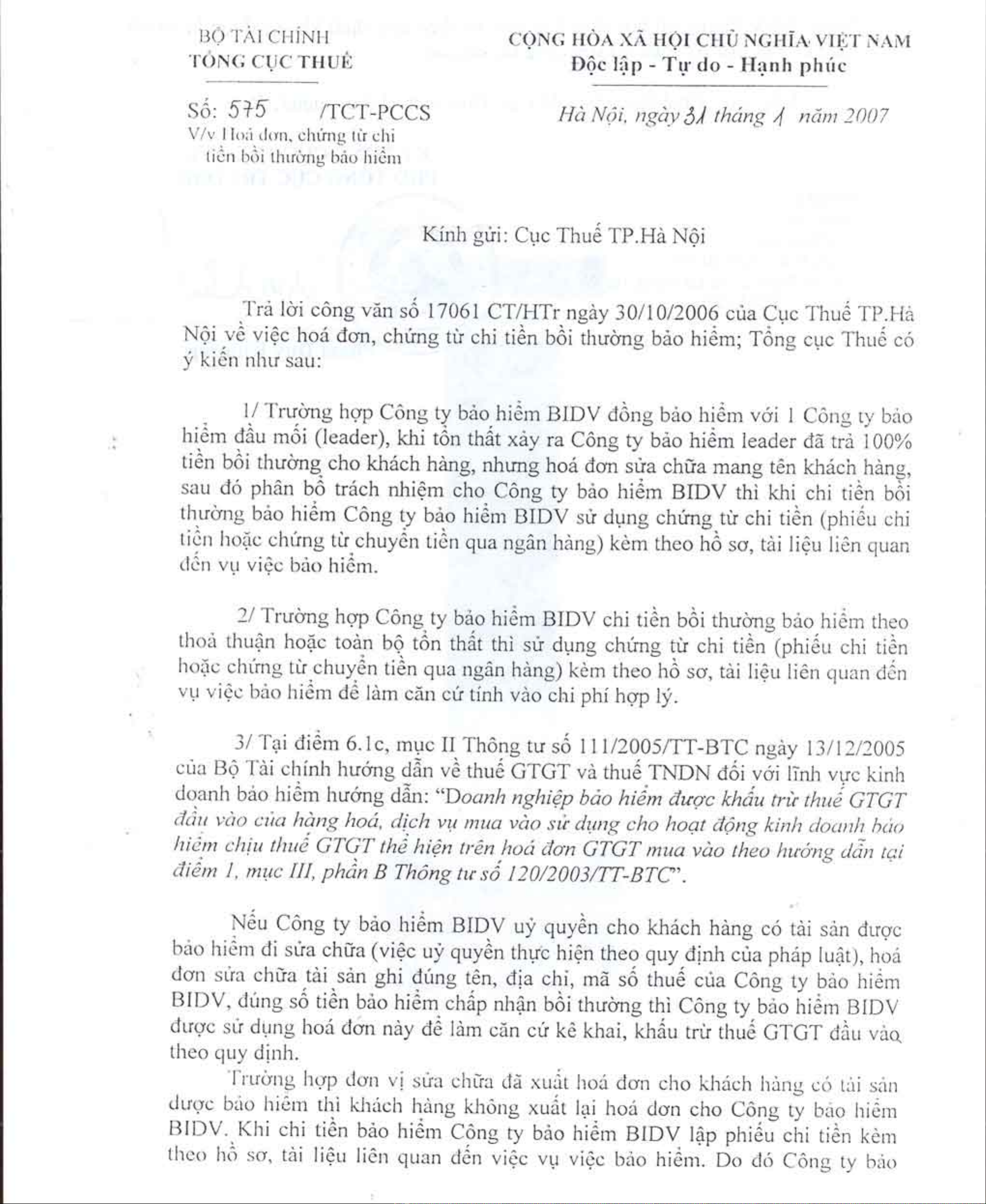 Công văn 575/TCT-PCCS của Tổng cục Thuế về việc hoá đơn, chứng từ chi tiền bồi thường bảo hiểm