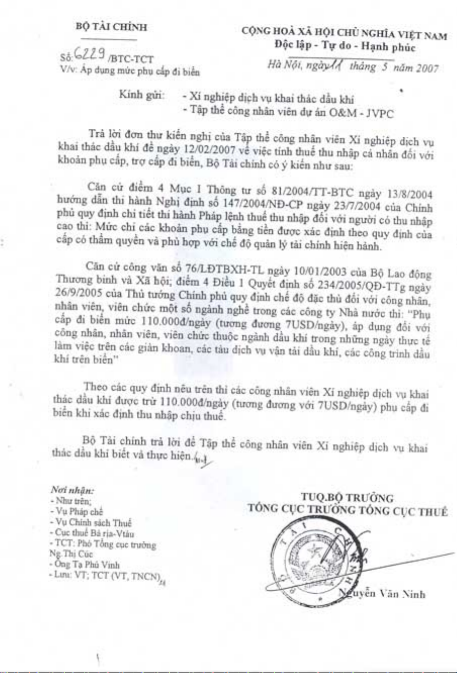 Công văn 6229/BTC-TCT của Bộ Tài chính về việc áp dụng mức phụ cấp đi biển