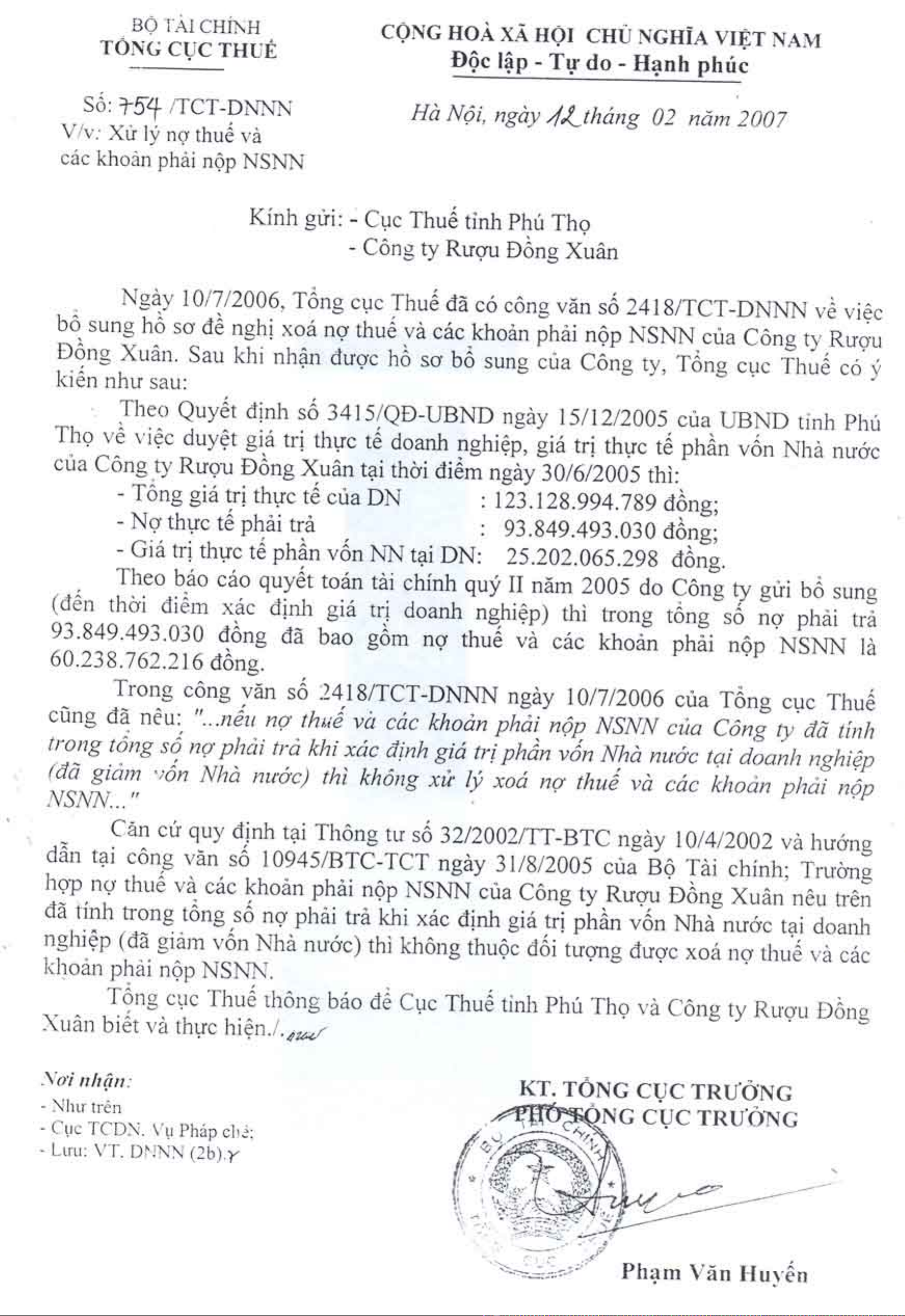 Công văn 754/TCT-DNNN của Tổng cục Thuế về việc xử lý nợ thuế và các khoản phải nộp ngân sách nhà nước