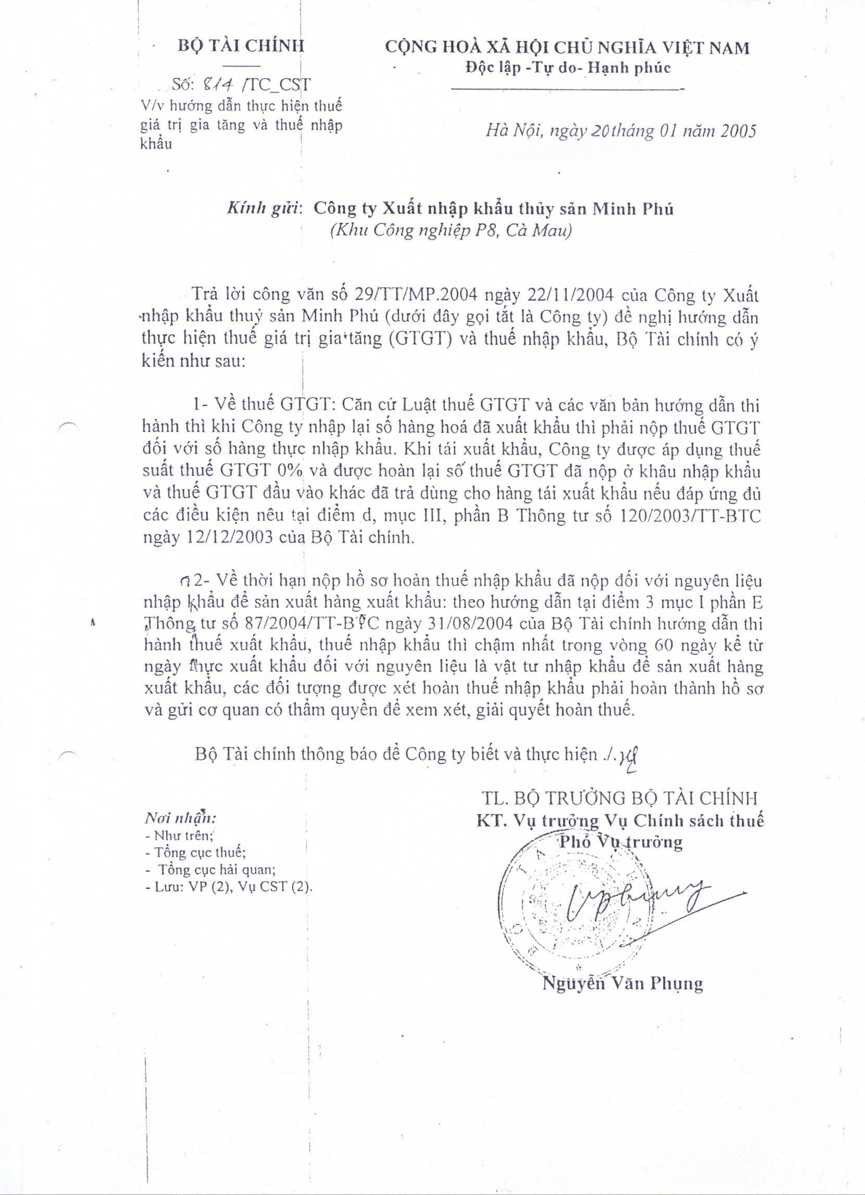 Công văn 814/TC/CST của Bộ Tài chính