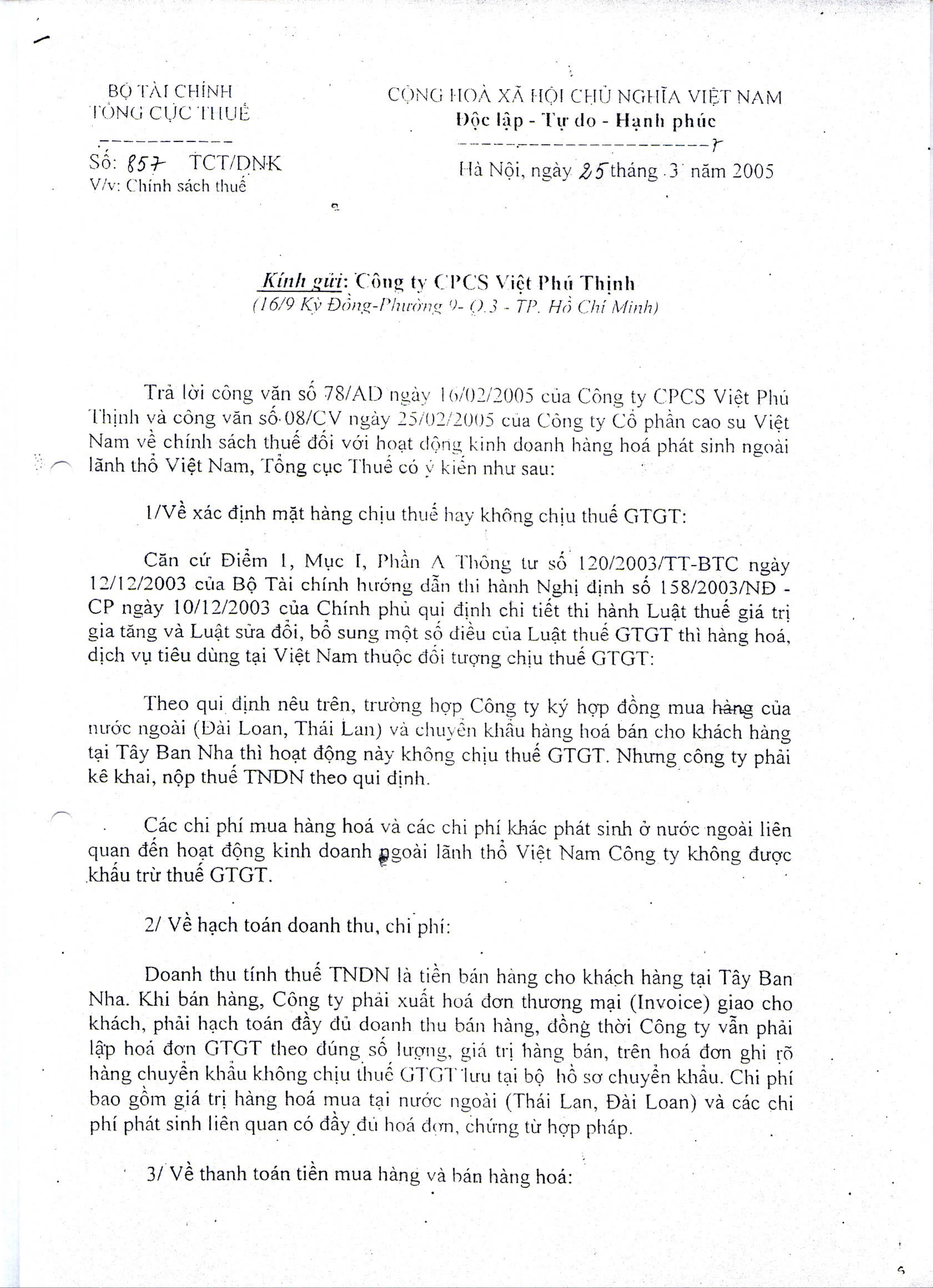 Công văn 857/TCT/DNK của Tổng cục Thuế