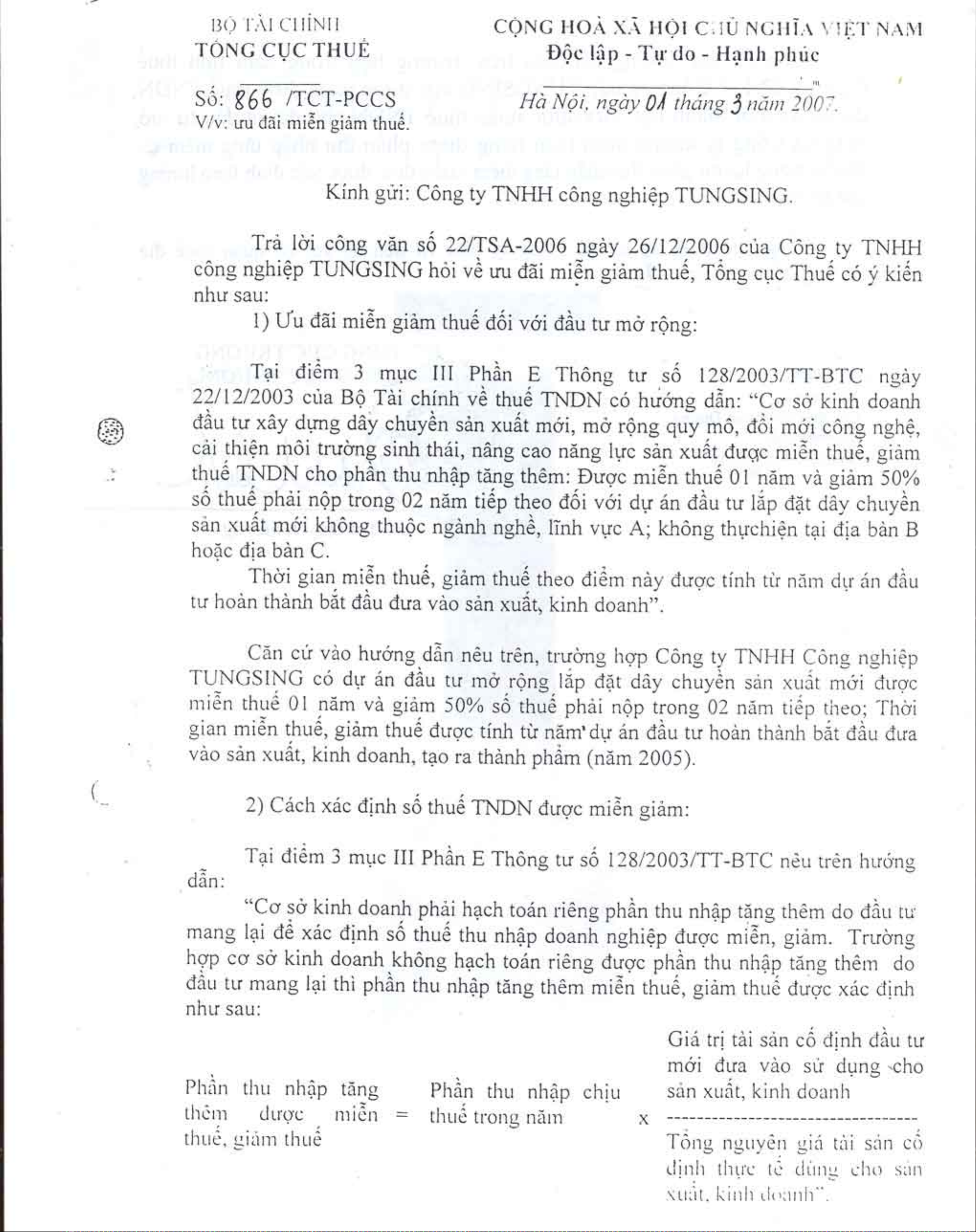 Công văn 866/TCT-PCCS của Tổng cục Thuế về việc ưu đãi miễn giảm thuế