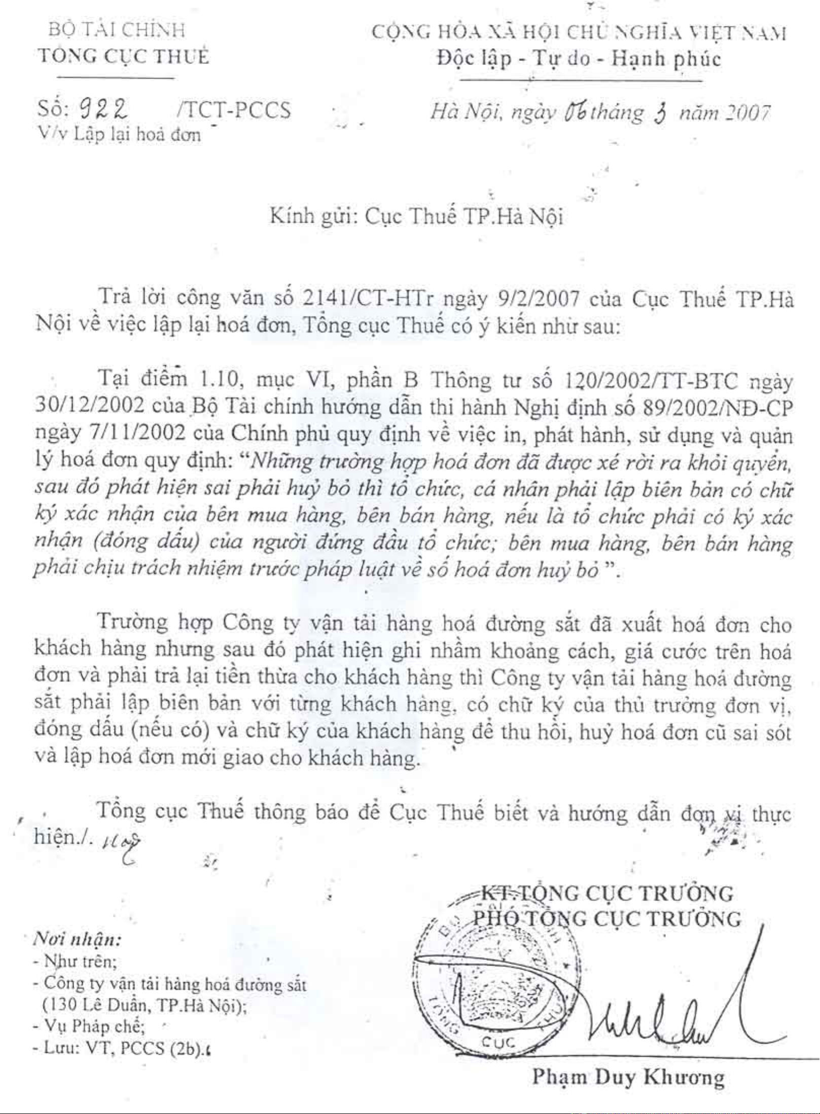 Công văn 922/TCT-PCCS của Tổng cục Thuế về việc lập lại hoá đơn